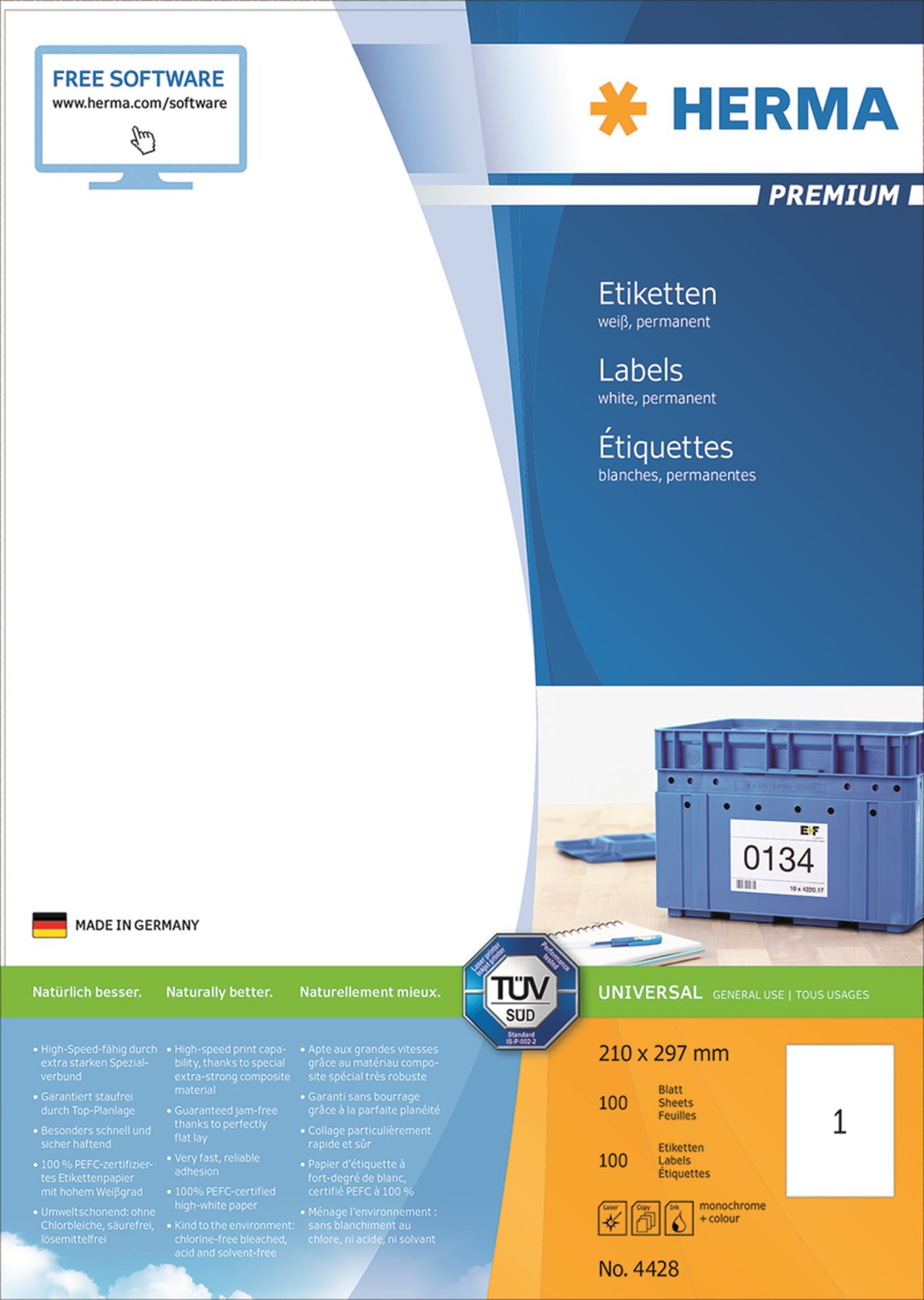Problemfria utskrifter, testat och bekräftat av TÜV SÜD. Extra kraftiga etiketter – lätta att lossa och fästa. Fäster säkert även på kalla och fuktiga ytor. Hög vithetsgrad och jämn yta för bästa utskriftsresultat i svart och färg. Blekt utan klor, syrafritt och lim utan lösningsmedel. För laser, bläckstråle och kopiatorer. 100 A4-ark/förp.