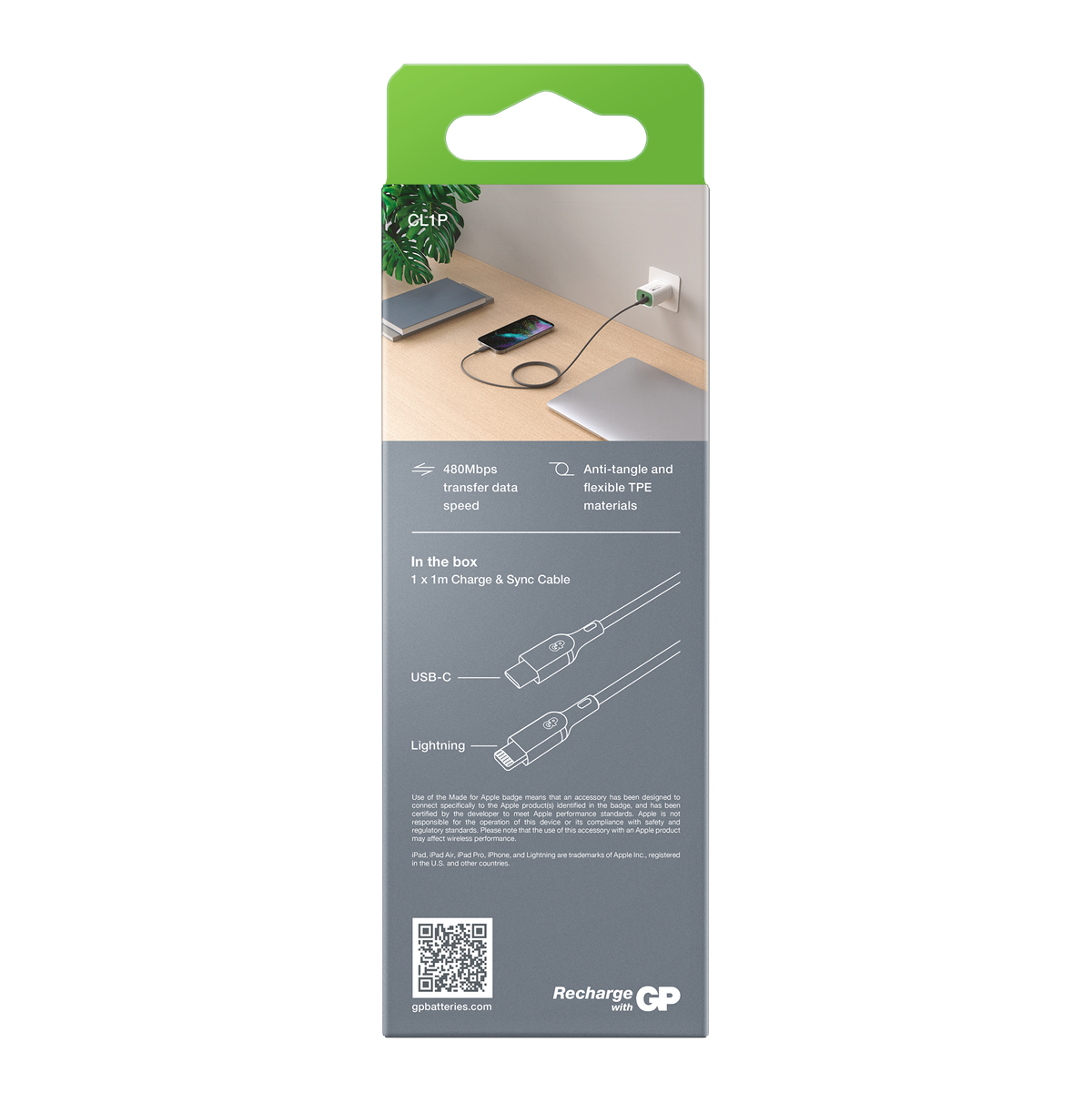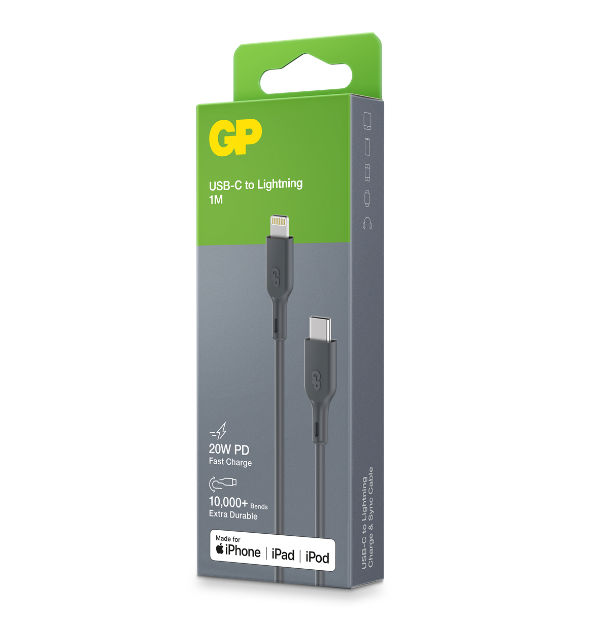 Charge & Sync-kabeln från GP är den perfekta kabeln för daglig användning. Kabeln är tillverkad av böjligt material som gör att den kan sträckas och böjas över 10 000 gånger utan att gå av. Den laddar en smartphone till 50 % på endast 30 minuter.* Med stöd för PD-laddning och med maximal uteffekt på 20 W är den kompatibel med en mängd olika applikationer. Kabeln kan användas för 480 Mbps höghastighetsöverföring av alla filtyper så att data kan överföras blixtsnabbt.