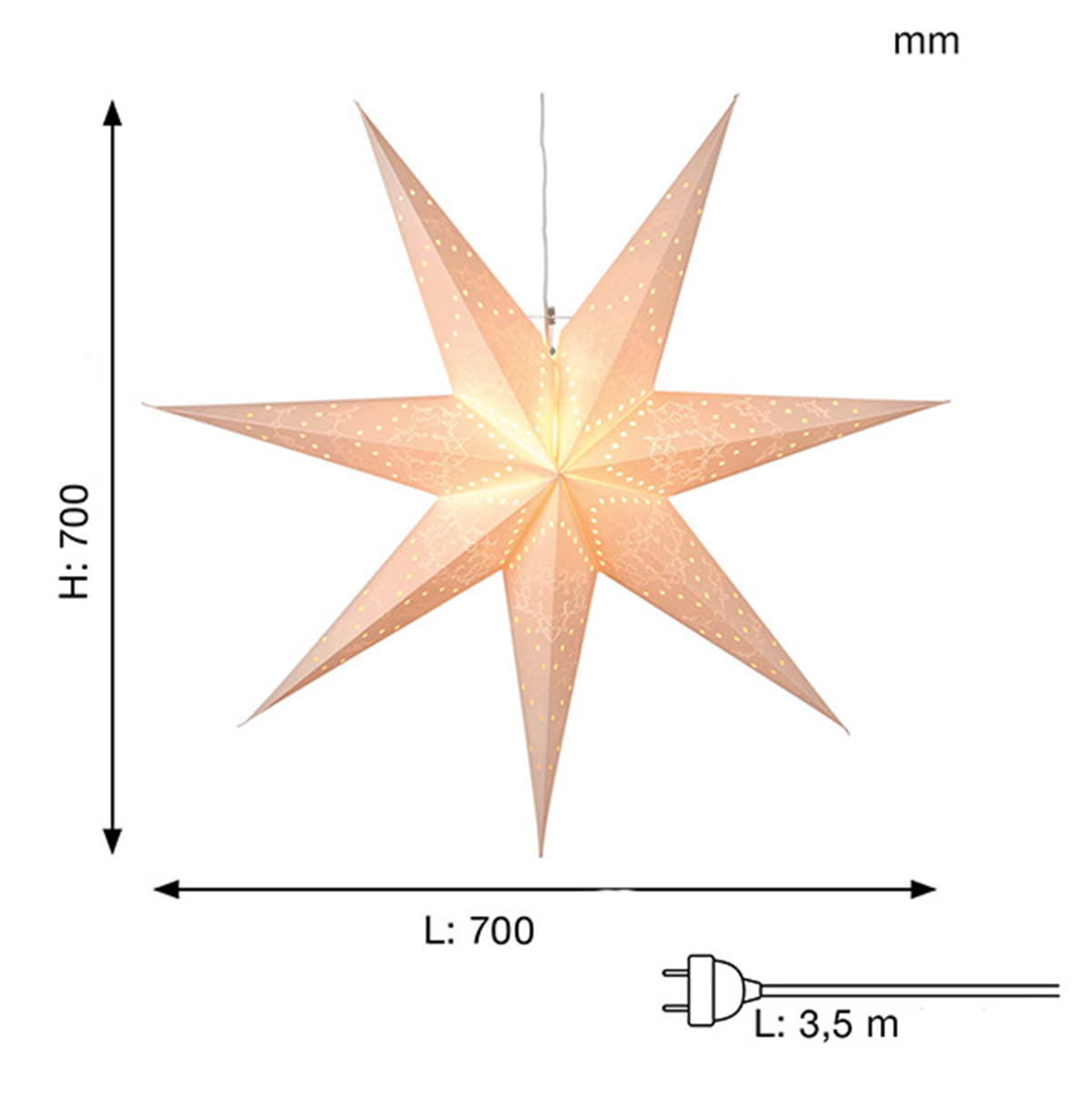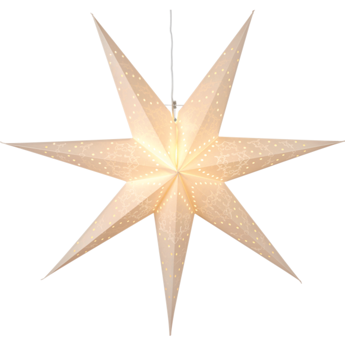 Mönstrad pappersstjärna i vit design. Fin stjärna att dekorera med i fönstret. Inkl. 3,5 m kabel, exkl. ljuskälla (E14). Mått: 70 x 70 cm.