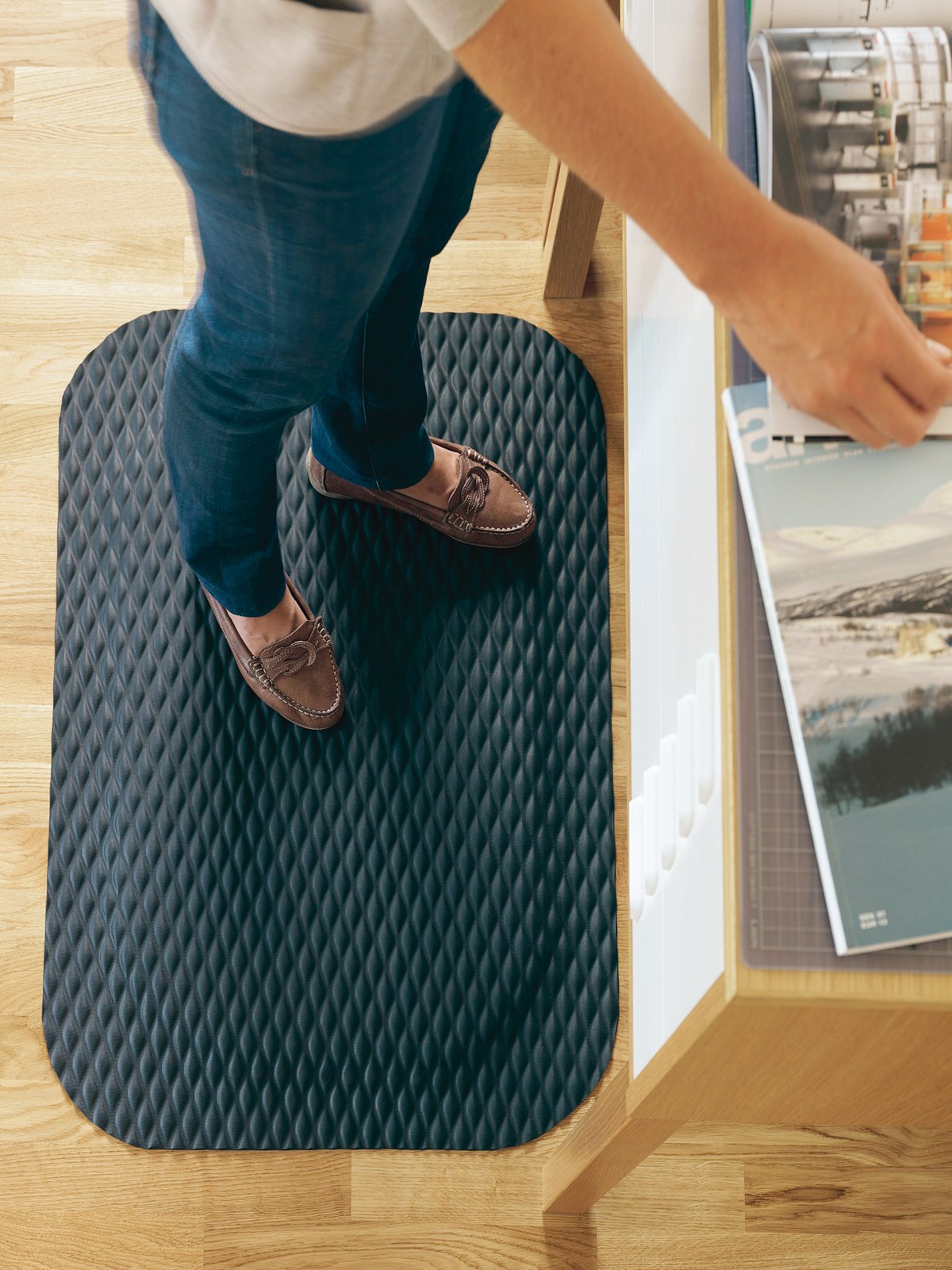 En mycket mjuk och avlastande matta att användas vid ditt höj- och sänkbara skrivbord. Lätt att skjuta undan och att hålla ren. Tåligt ytskikt av nitrilgummi som klarar skoklackar. Motverkar trötta ben och leder när man står och arbetar. Svart. 16 mm tjock.