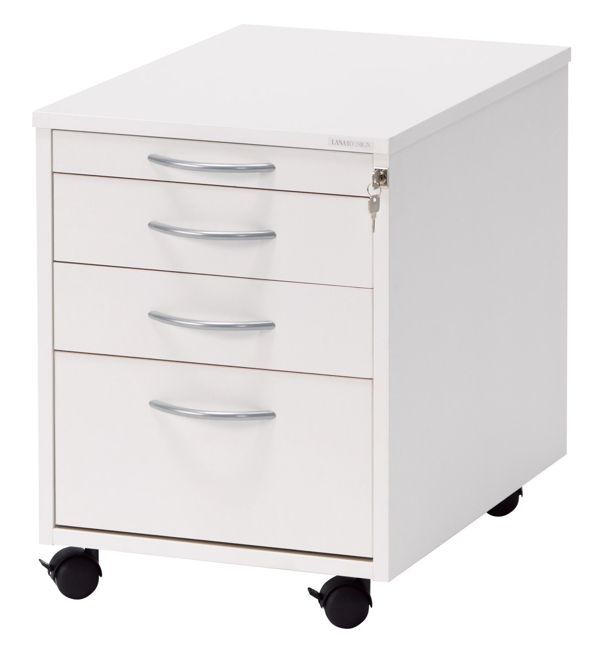 Rullhurts i laminat med 4 lådor. Inklusive penninsats och centrallås. Höjd, 550 mm, bredd 420 och djup 600 mm. Frakt tillkommer, kontakta oss för prisuppgift.