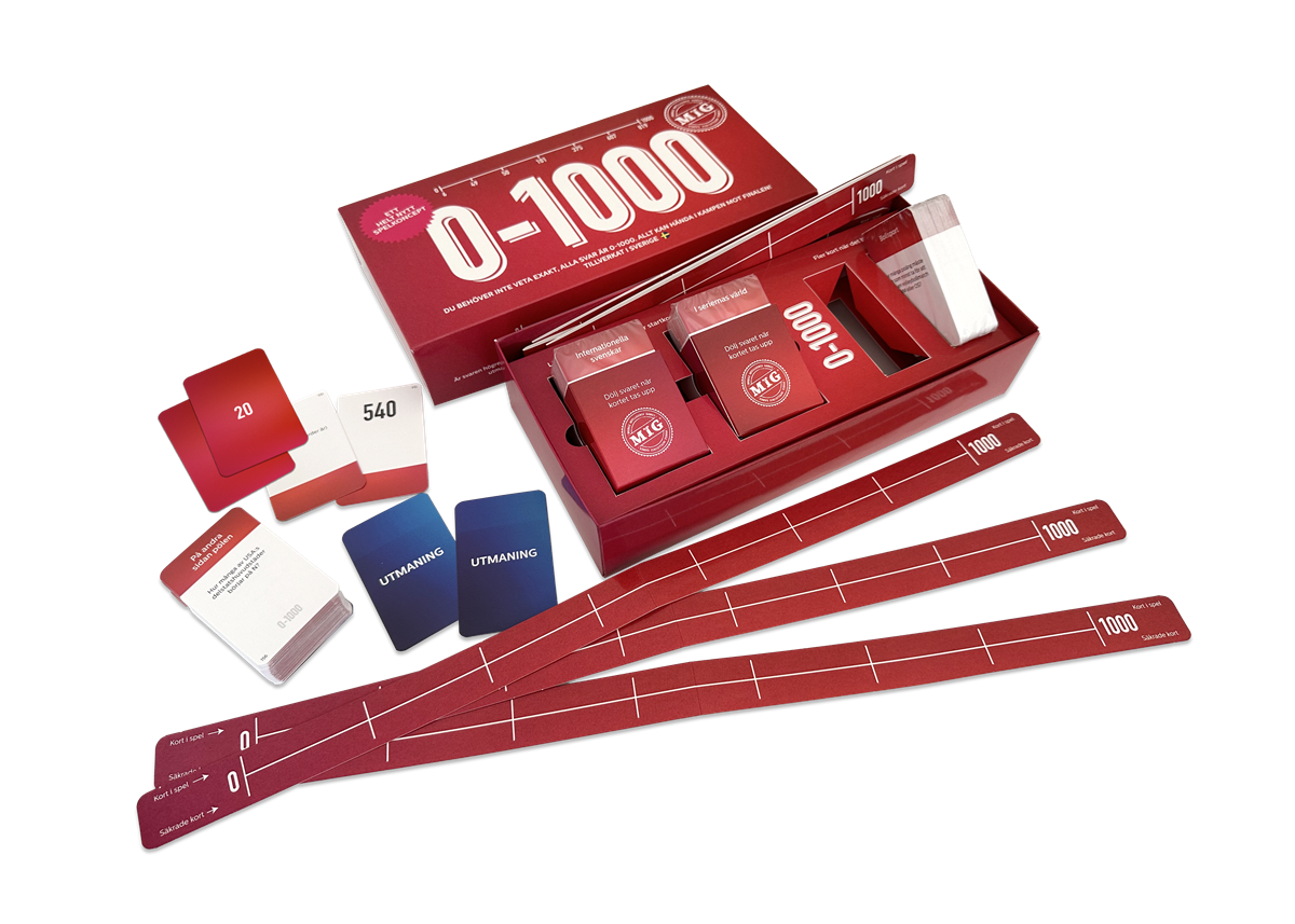 0-1000 är ett helt nytt spännande spelkoncept som fått fem getingar i Expressens speltest. Spelet är i samma anda som de superpopulära 0-100-spelen, men med helt nytt spelsätt. Här får alla spelare en tallinje. Alla svar är ett tal mellan 0 och 1000 och spelarna ska rangordna svaren på tallinjen, från lägst till högst. Vi garanterar massor av skratt och spelglädje. Vågar du chansa och ta ett kort till eller ska du spela säkert? Och spelarna kan alltid komma ikapp, ofta är det inte den som når finalen först som vinner! Här behöver du inte veta det exakta svaret, det räcker med att ha ett hum – eller gissa bra. När du har sju kort, inklusive startkortet, på tallinjen så är du i final. Lyckas du då ta två kort i rad har du vunnit.