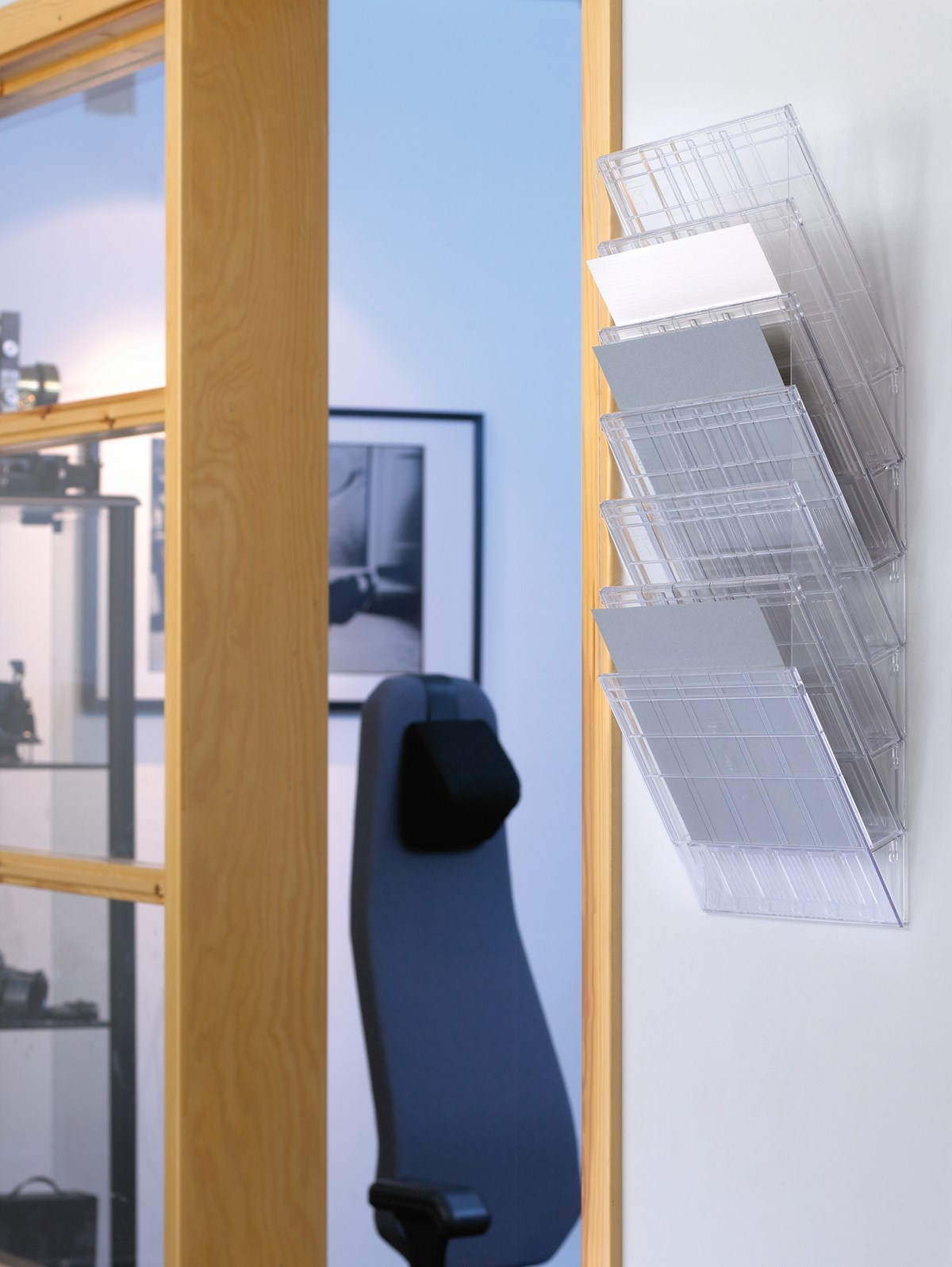 För överskådlig förvaring av broschyrer och blanketter. Av styrenplast. För liggande A4-format. Mått: 625x350x95 mm.