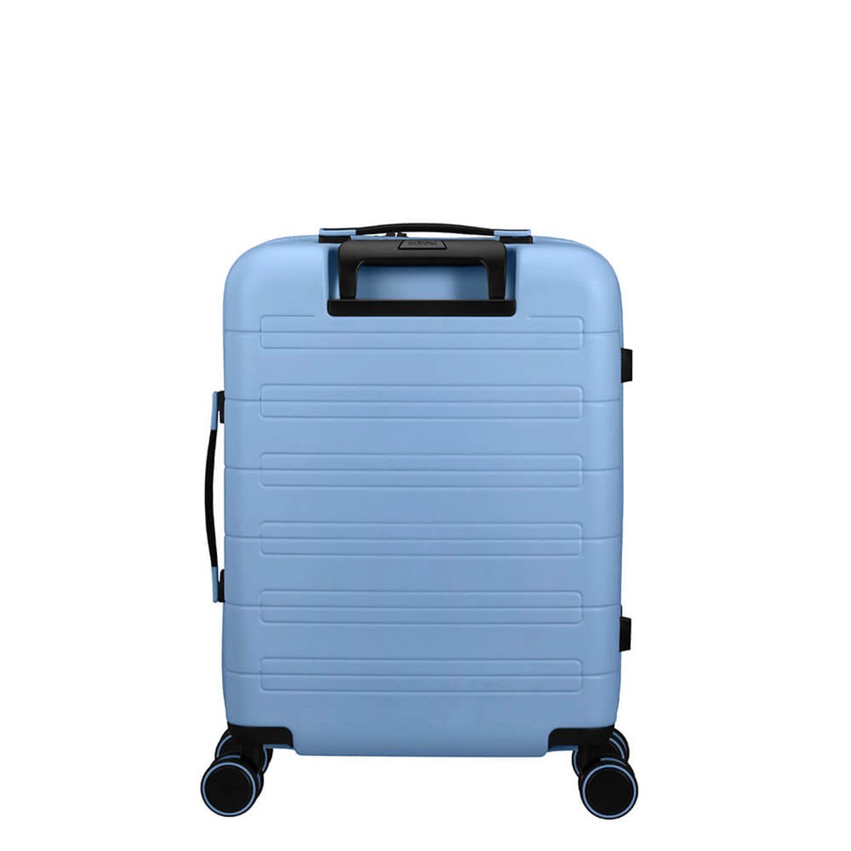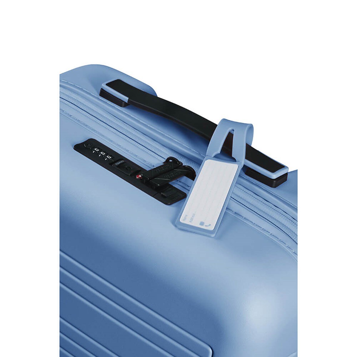 American Tourister, Nova Stream Spinner 55/20 Expand är godkänd som kabinväska, är expanderbar, har ett fast tresiffrigt TSA-kombinationslås och smidigt rullande dubbla hjul. Ergonomiska handtag. Matt finish. Väskan har måtten 40 x 55 x 20/23 cm, rymmer 36/41 L och väger 2,6 kg. Den är tillverkad av 100% polykarbonat och rPet Polyester av 9 återvunna PET-flaskor med Recyclex-materialteknologi.