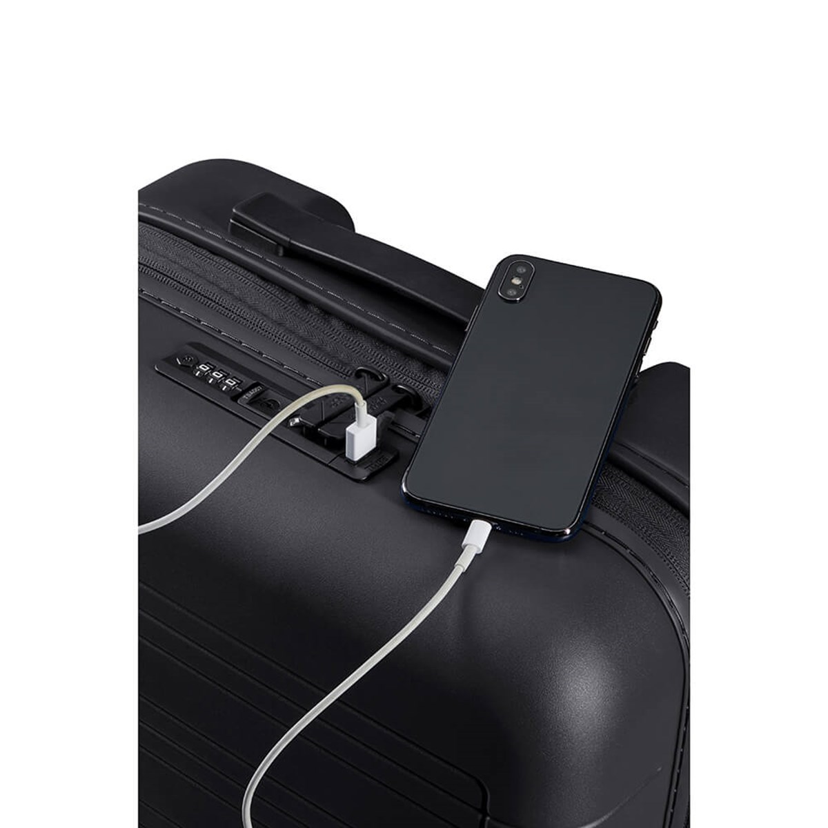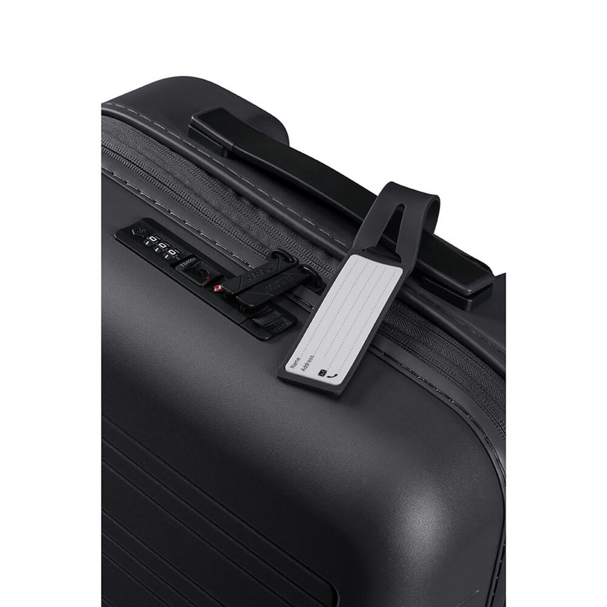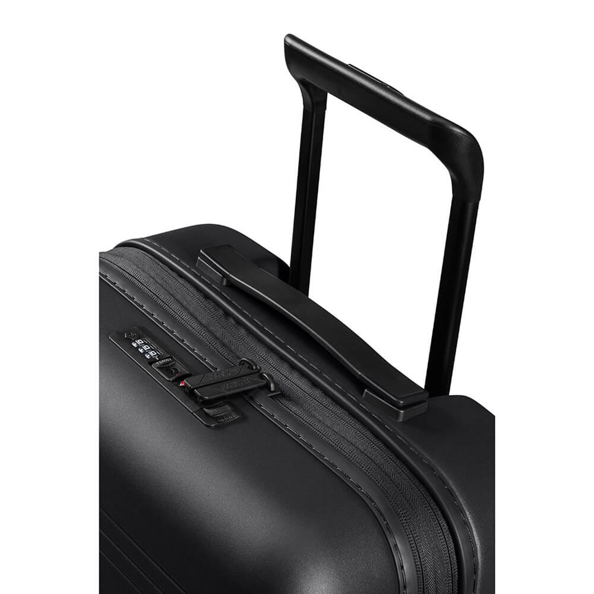 American Tourister, Nova Stream Spinner 55/20 Expand är godkänd som kabinväska, är expanderbar, har ett fast tresiffrigt TSA-kombinationslås och smidigt rullande dubbla hjul. Ergonomiska handtag. Matt finish. Väskan har måtten 40 x 55 x 20/23 cm, rymmer 36/41 L och väger 2,6 kg. Den är tillverkad av 100% polykarbonat och rPet Polyester av 9 återvunna PET-flaskor med Recyclex-materialteknologi.