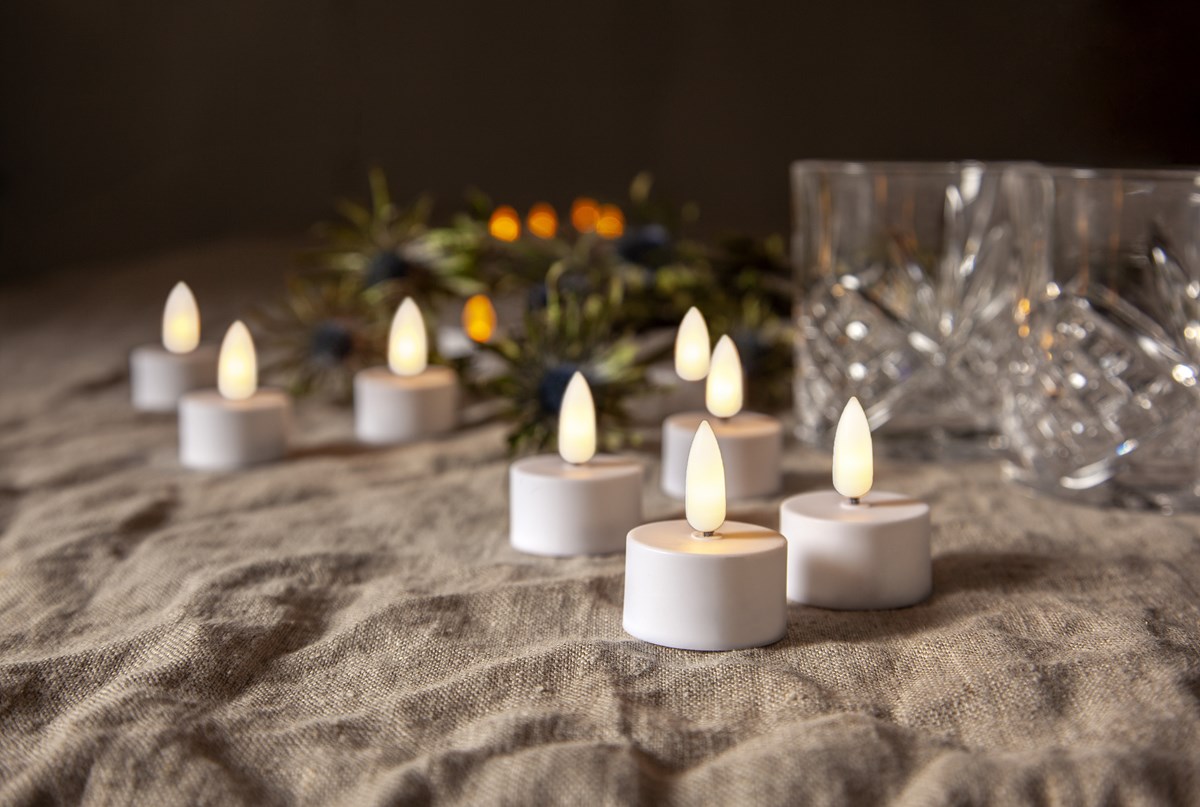 Värmeljus i LED med en varmvit låga. Brinntid ca 80 timmar. Med inbyggd timer. 6 timmar på, 18 timmar av, repeterande. Drivs med 2 st CR2032-batterier (ingår).