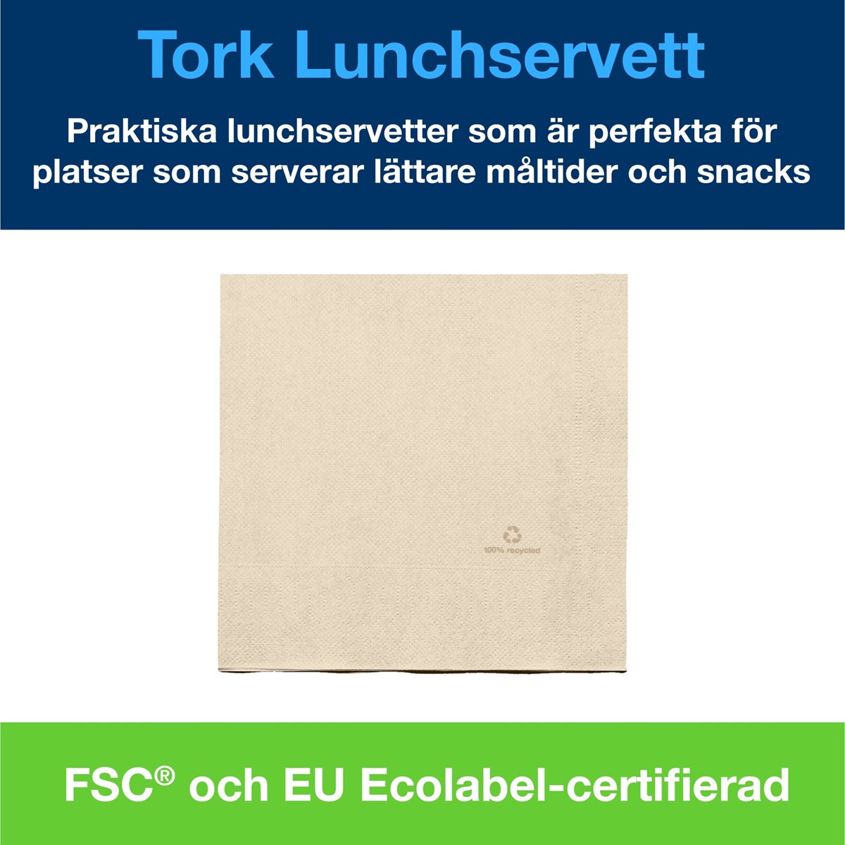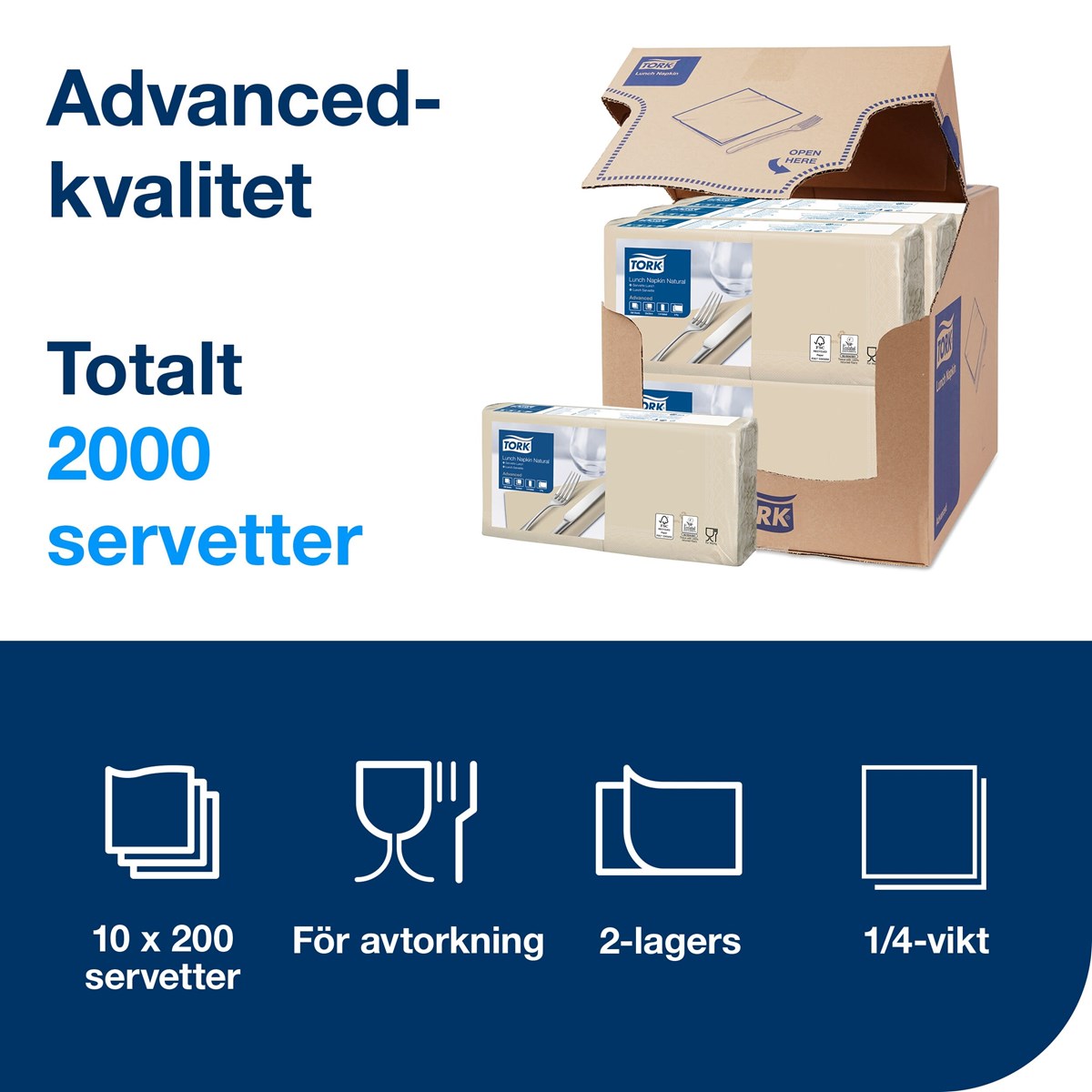 2-lags, naturligt brun servett i hög kvalitet (Advanced). Tillverkat av 100% återvunnet material. Innehåller varken blekmedel eller färgämnen vilket skapar en naturlig färgton. Komposterbar (EN13432). Förtryckta med texten 100% recycled för att stärka det miljömässiga budskapet på servetten. 1/4-vikta. Mått: 33x33 cm. 200 st/förp. 2000 st/kartong.