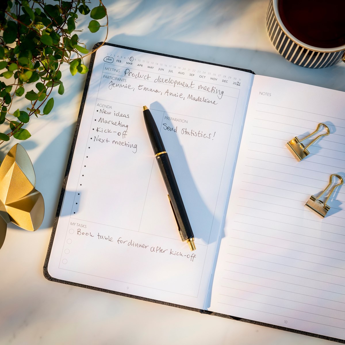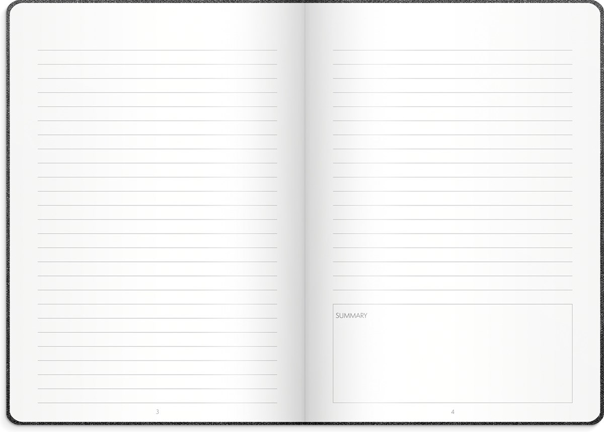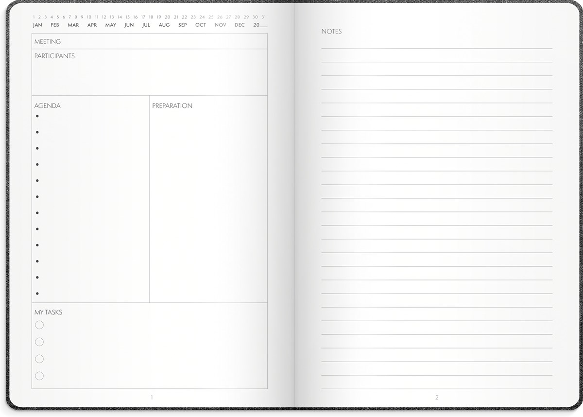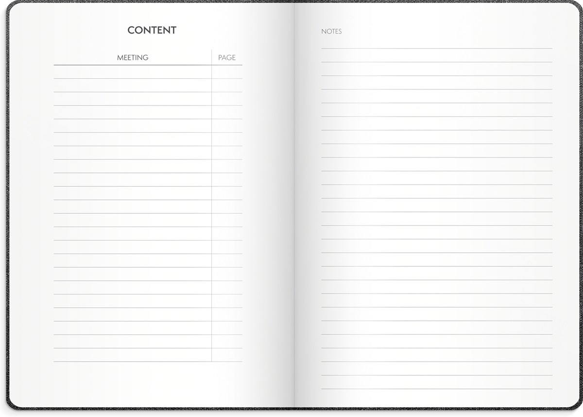 Anteckningsbok framtagen för möten. Skriv ner agendan och vad som behöver förberedas. 3st anteckningssidor finns för varje möte. Plats för 44 möten. Omslag i konstläder, inbunden med gummiband och märkband. 100g vitt papper, 96 blad. Format: 140x210 mm.