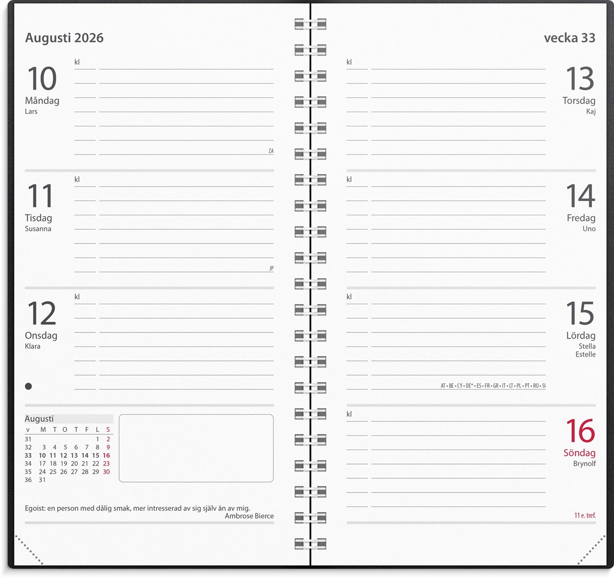 Format: 83x158 mm. Layout: Liggande. Vecka/uppslag. Kalendarium: 2025-12-08 - 2027-01-03. Omslag: Plast. Spiralbunden. Innehåll: Kyrkliga helgdagar, Flaggdagar, Helgdagar/aftnar, Internationella helgdagar, Månfaser, Namnsdagar, Internationella helgdagar översikt, Telefonregister, Temadagar/händelser, Årsöversikt/årsöversikter, Årsplan/årsplaner. Antal sidor: 128. Miljöinformation: FSC®.