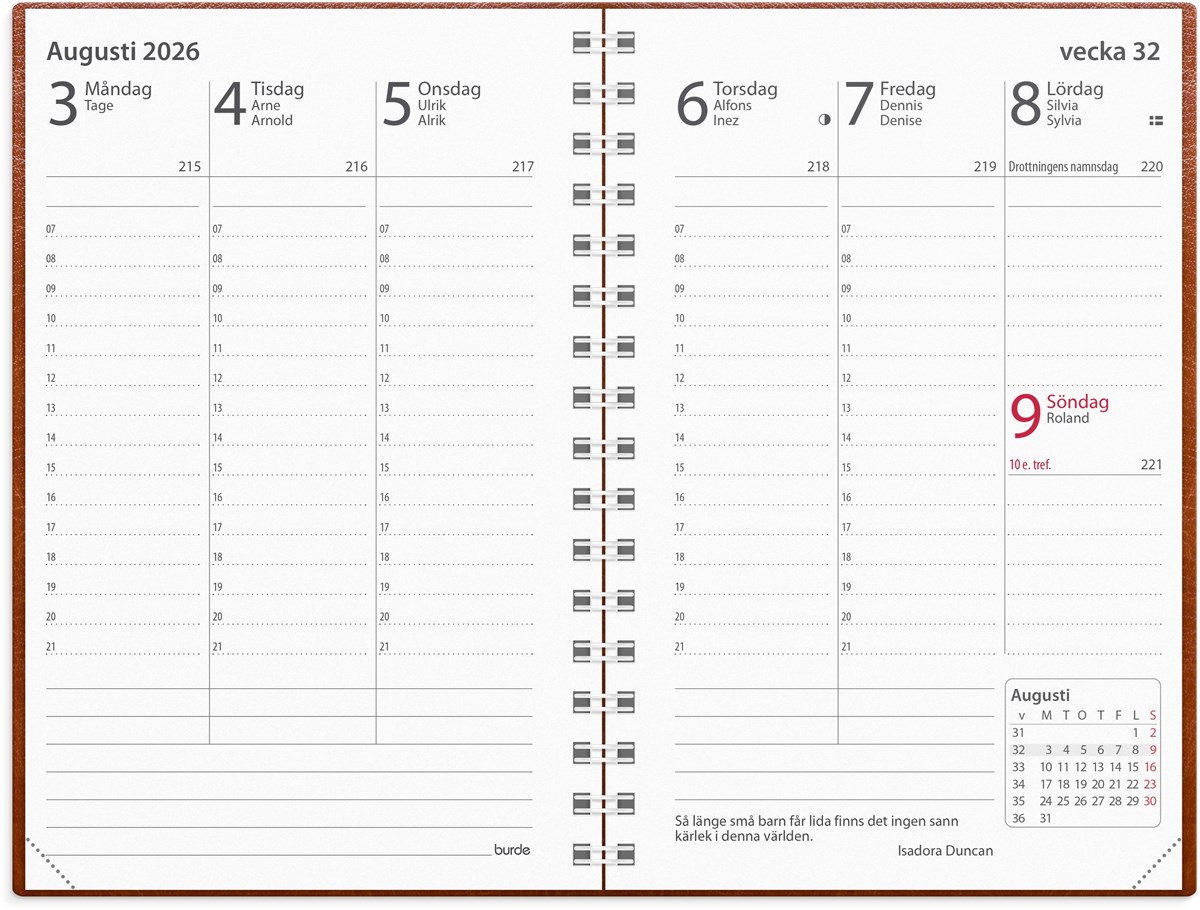 Format: 83x127 mm. Layout: Stående. Vecka/uppslag. Timindelning 7-21. Kalendarium: 2025-12-08 - 2027-01-03. Omslag: Konstläder. Spiralbunden. Innehåll: Atlas, Anteckningshäfte, Årsöversikt/årsöversikter, Årsplan/årsplaner. Antal sidor: 152. Miljöinformation: FSC® papper.