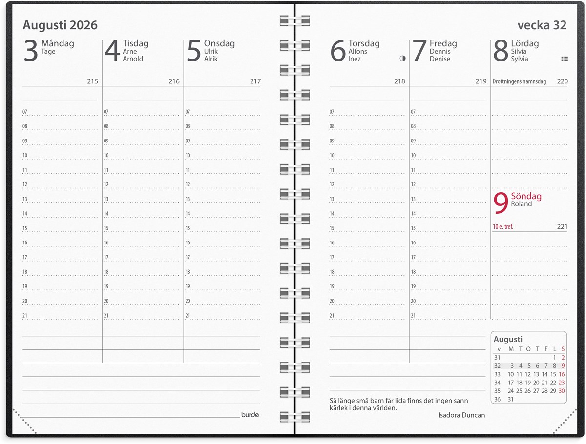 Format: 83x127 mm. Layout: Stående. Vecka/uppslag. Timindelning 7-21. Kalendarium: 2025-12-08 - 2027-01-03. Omslag: Plast. Spiralbunden. Innehåll: Kyrkliga helgdagar, Flaggdagar, Helgdagar/aftnar, Månfaser, Namnsdagar, Internationella helgdagar översikt, Telefonregister, Temadagar/händelser, Årsöversikt/årsöversikter, Årsplan/årsplaner. Antal sidor: 128. Miljöinformation: FSC®.