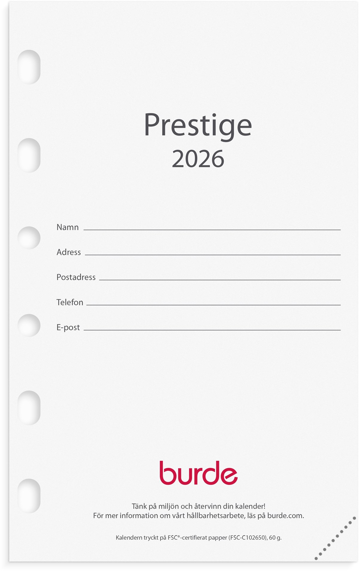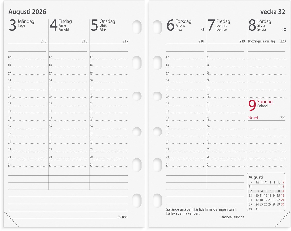 Hålad kalenderrefill till systemkalender med ringmekanism.