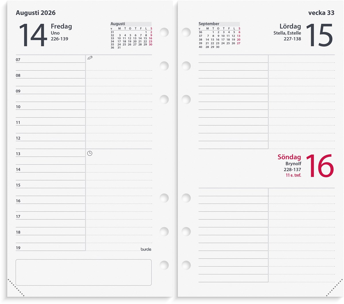 Hålad kalenderrefill till systemkalender med ringmekanism.