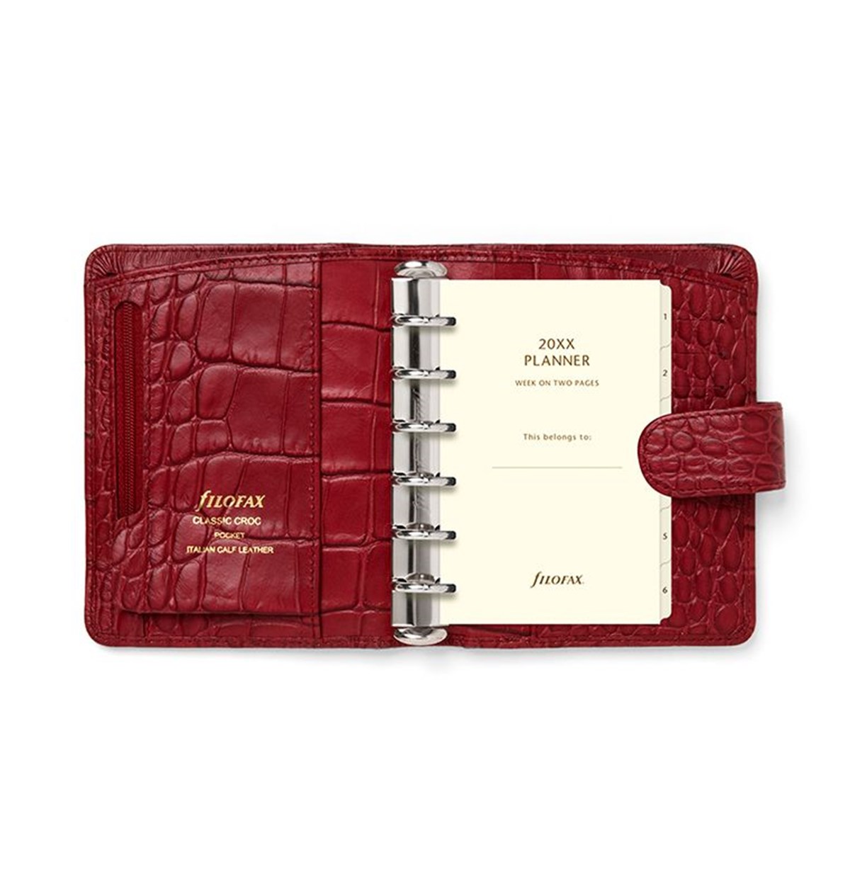 Härligt mjuk pärm tillverkad av lyxigt italienskt kalvskinn med krokodilmönster. Rustad med stor ficka för lagring av större anteckningar. Dagbok vecka per uppslag, linjal/sidomarkör, att göra lista, kontakter, index, vit anteckningsblock, färgad anteckningsblock.