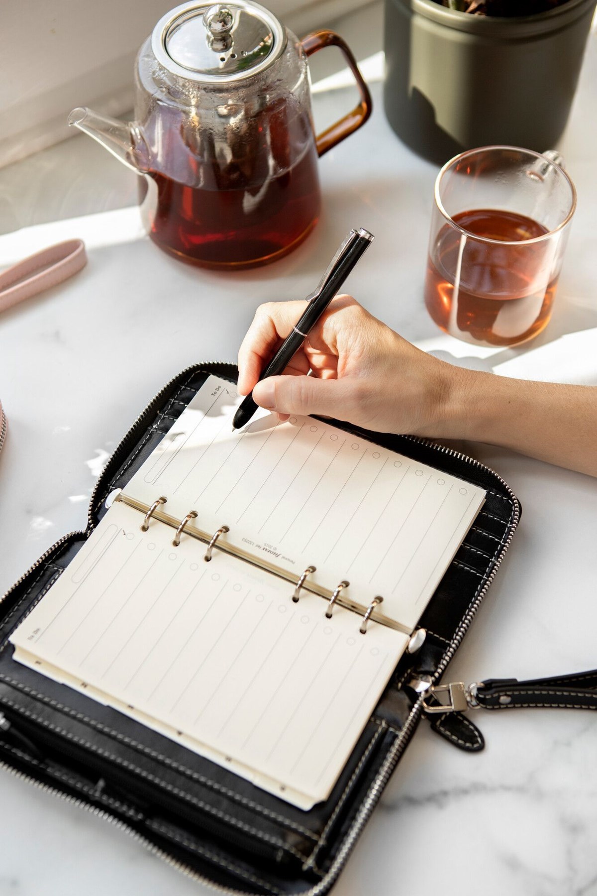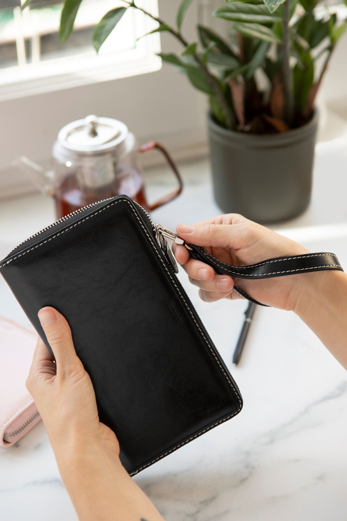 Malden systemkalender i ett delikat premiumläder. Rustik, men ändå mjuk och följsam med kraftig dekorsöm och slejf. Praktisk ficka med dragkedja på insidan. Inbyggd RFID-kortskydd för att skydda kredit- och betalkort, en avtagbar handledsrem och en avtagbar ringmekanism för att möjliggöra användning som handväska endast. För din dagliga planering och projektledning innehåller den också en dagbok (vecka per uppslag) tryckt på 80g lyxig krämfärgat, papper.