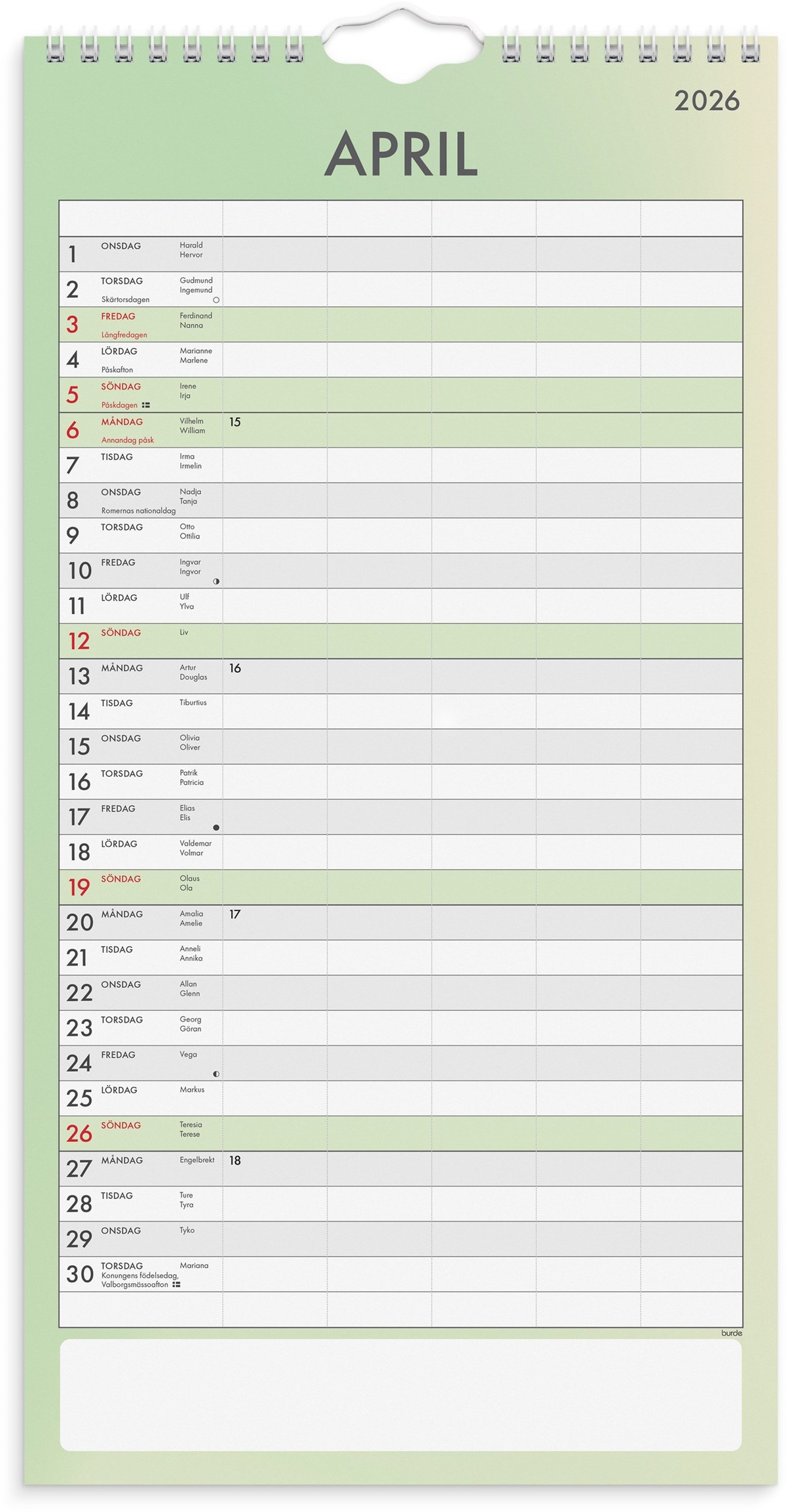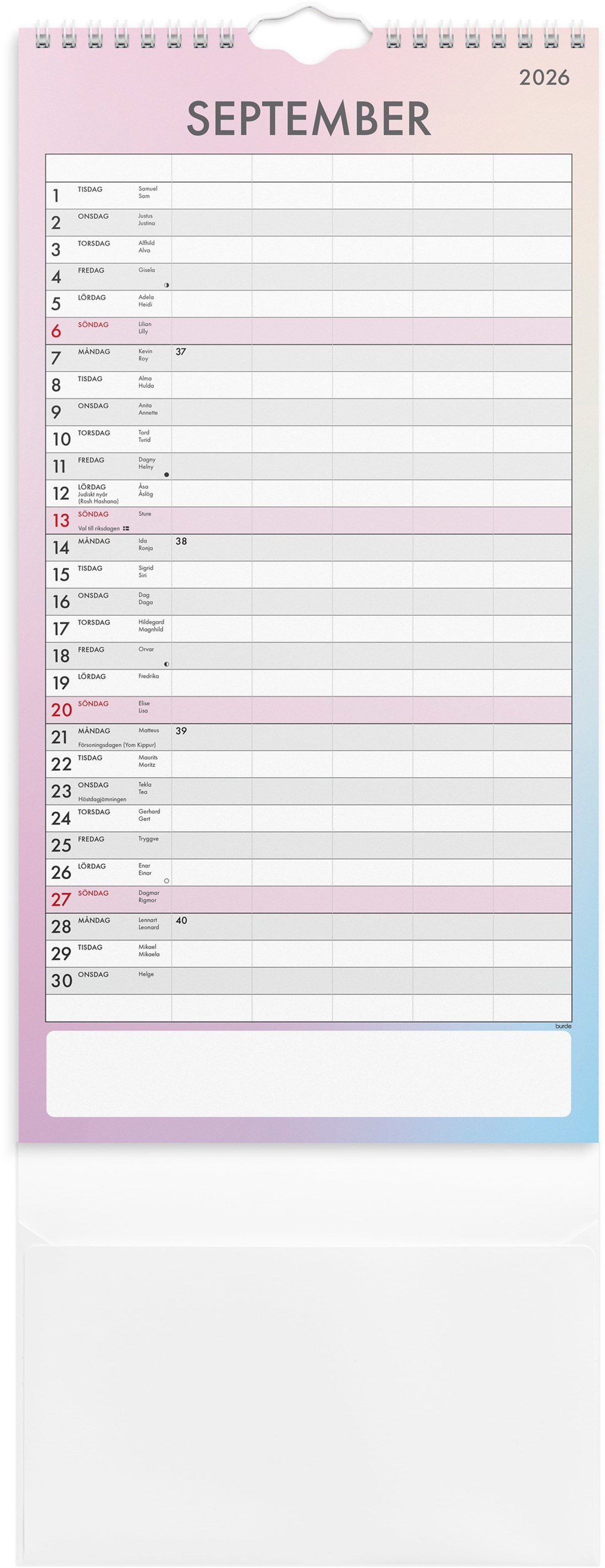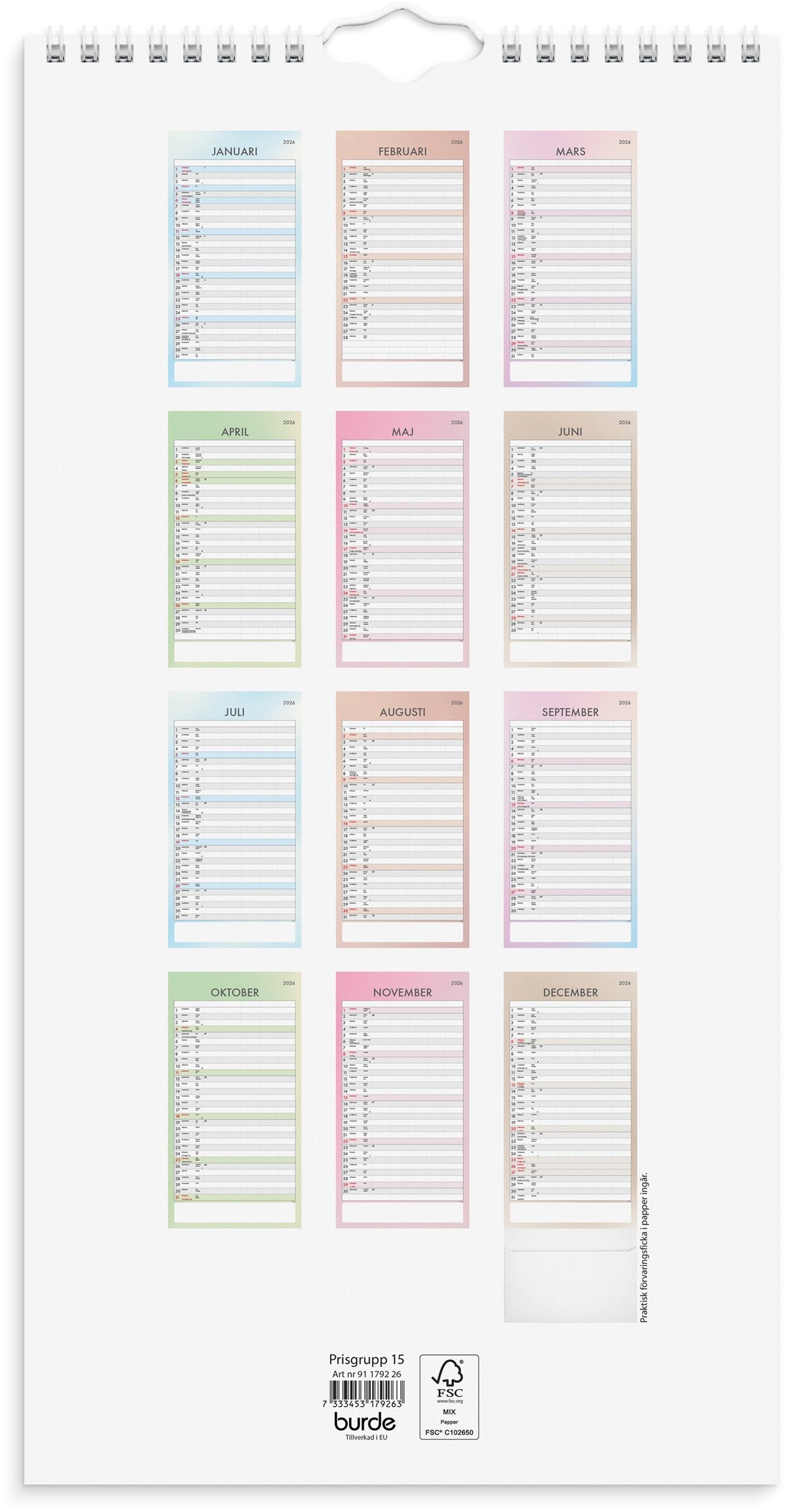 FamiljeFormat: 220x430 mm. Layout: Månad/blad. Kalendarium: 2026-01-01 - 2026-12-31. Spiralbunden. Detaljer: Pappersficka. Innehåll: 5 kolumner, Flaggdagar, Månfaser, Namnsdagar. Antal sidor: 12. Miljöinformation: FSC®.
