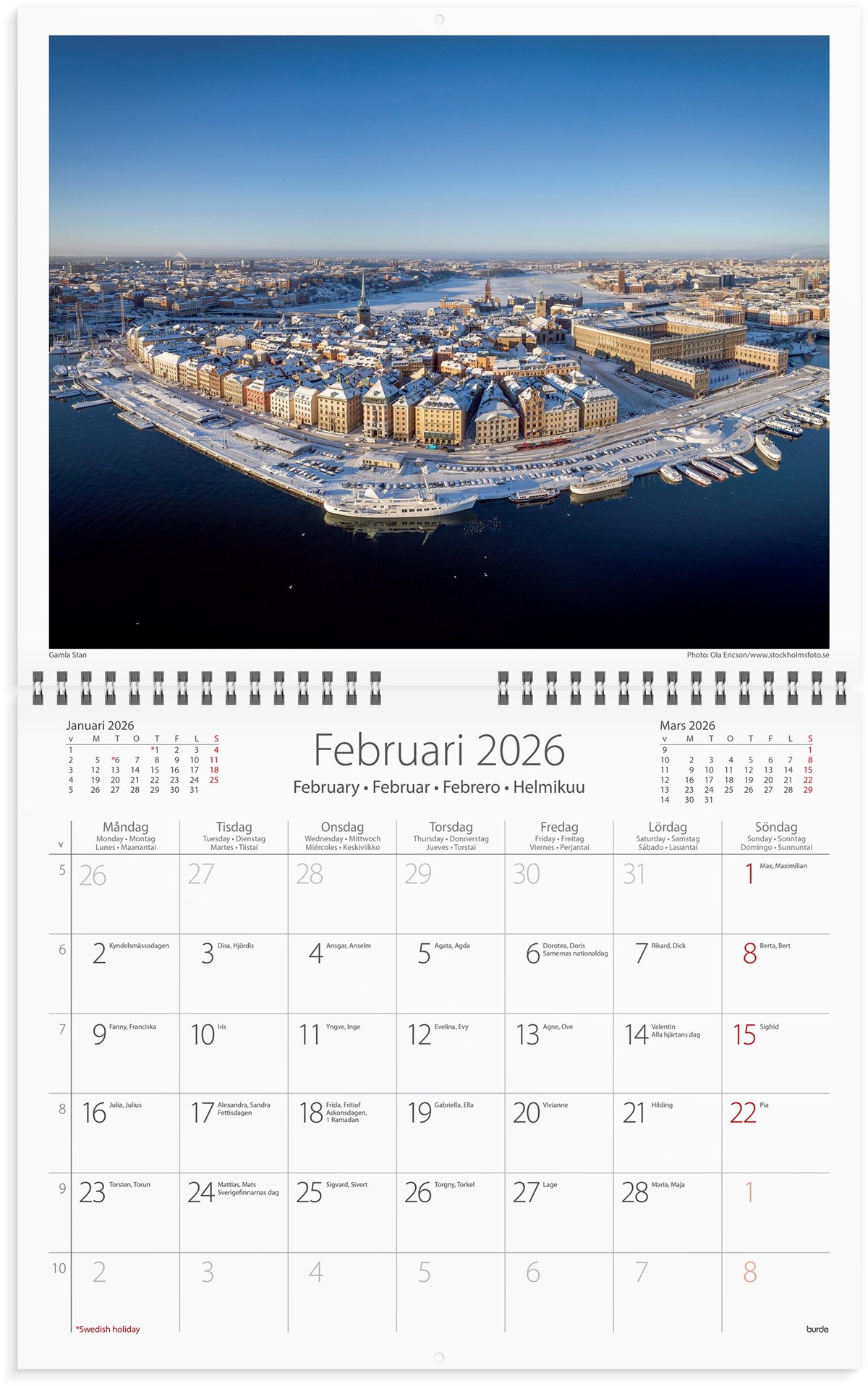 Format: 300x240 mm. Layout: Månad/blad. Kalendarium: 2026-01-01 - 2026-12-31. Spiralbunden. Innehåll: Flaggdagar, Helgdagar/aftnar, Namnsdagar, Internationella helgdagar översikt, Temadagar/händelser. Antal sidor: 12. Miljöinformation: FSC®.