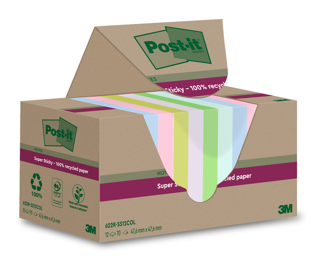 Post-It 100% Recycled 47,6x47,6 mm blandade vårfärger 12/fp