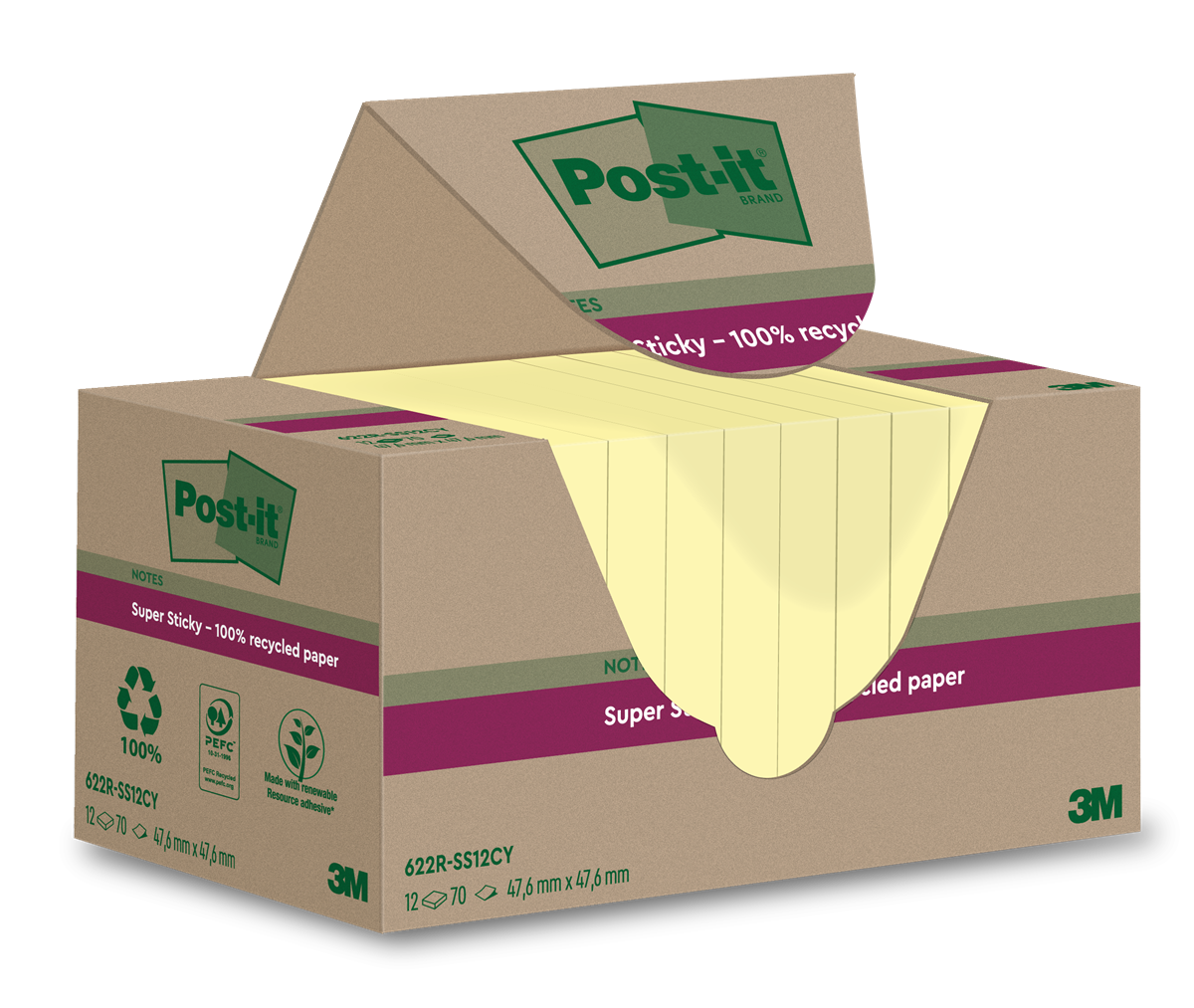 Post-it® Recycled Super Sticky Notes är tillverkade av 100 % återvunnet papper och är återvinningsbara. Dessa självhäftande notes är perfekta för att göra anteckningar eller lämna meddelanden och påminnelser på. De är perfekta för vertikala och ojämna ytor så att du kan fästa dem där du behöver dem. Super Sticky Notes har dubbelt så stark häftförmåga som Post-it® Original Notes, så du kan vara säker på att ditt meddelande sitter kvar. Tillverkas av PEFC-certifierade pappersfibrer, som kommer från hållbart skogsbruk och kontrollerade resurser. De har ett häftämne som tillverkas av en förnybar resurs, som till 60 % kommer från en växt som växer upp igen varje år. Förpackningen tillverkad av återvunnen wellpapp kan användas för att enkelt förvara dina notes i ett skrivbord eller skåp och kan återvinnas när de inte behövs längre.