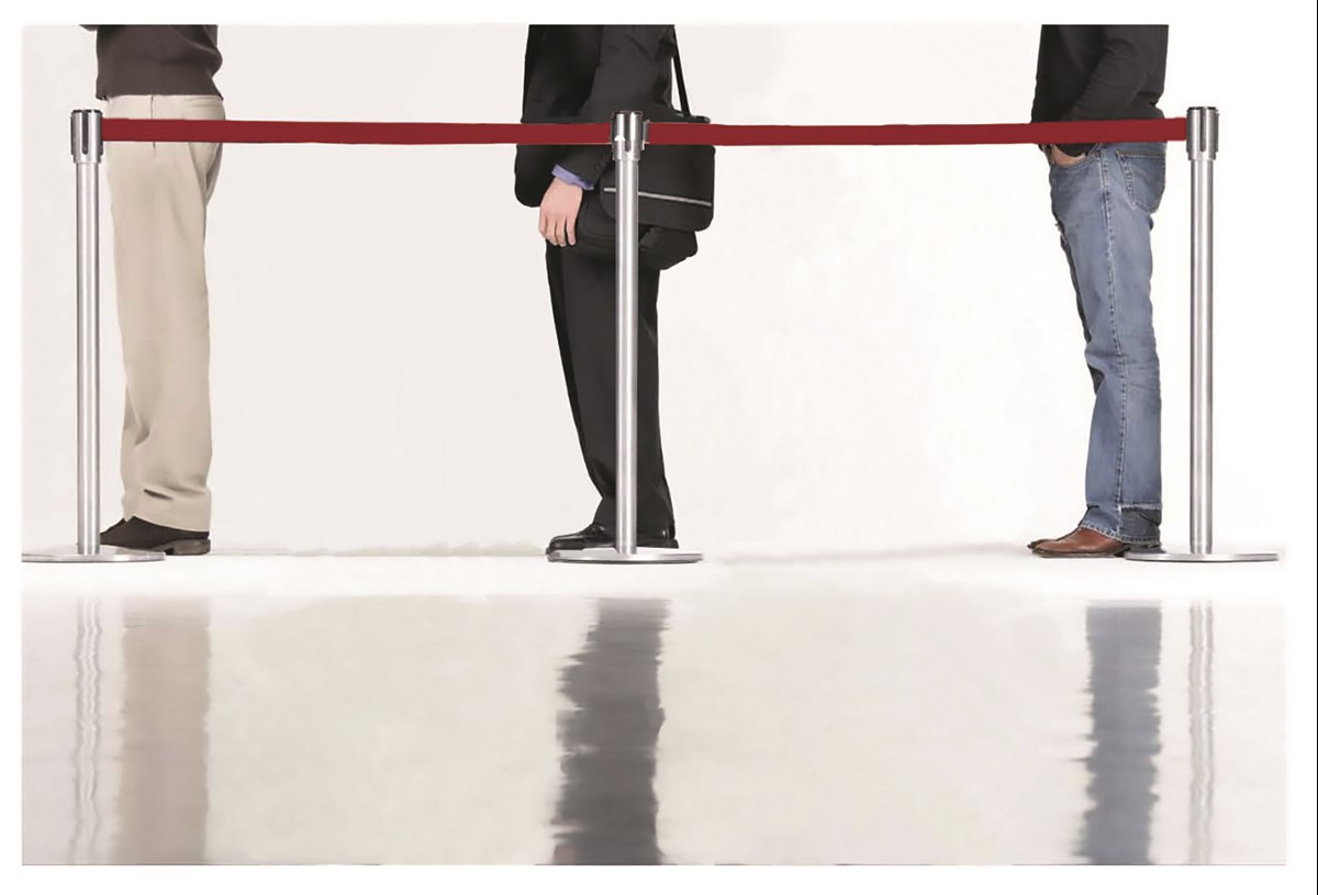 Spärra på ett enkelt sätt av ett område eller strukturerar en kö. Stolpe i rostfritt stål med rund fot. Varje stolpe har ett rött fjäderbelastat rullband som enkelt fästs i nästa stolpe eller på vägg. 5 cm bredd och maxlängd 193 cm. Höjd 90 cm, vikt 9 kg.