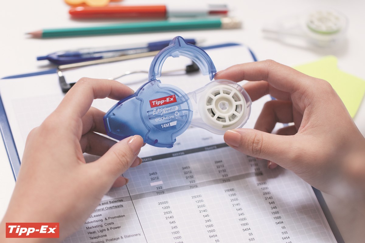 En korrigeringstejp av hög kvalitet som torkar direkt. Unikt system för enkel påfyllning. 100% återvinningsbar. 5 mm x 14 m. 10 st/förp.