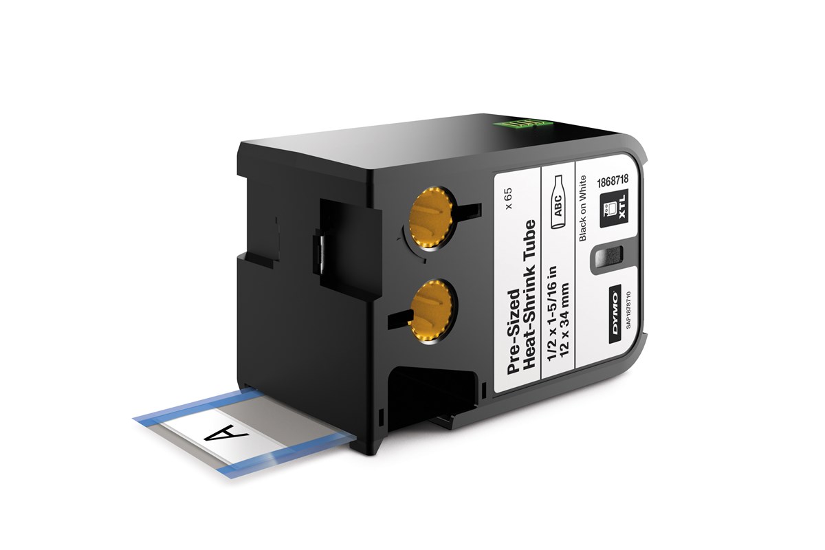 Förformaterad krympslang. Krympfaktor på 3:1, perfekt passning på sladdar och kablar. Svart text/vit tejp. Fungerar endast med Dymo XTL 500.