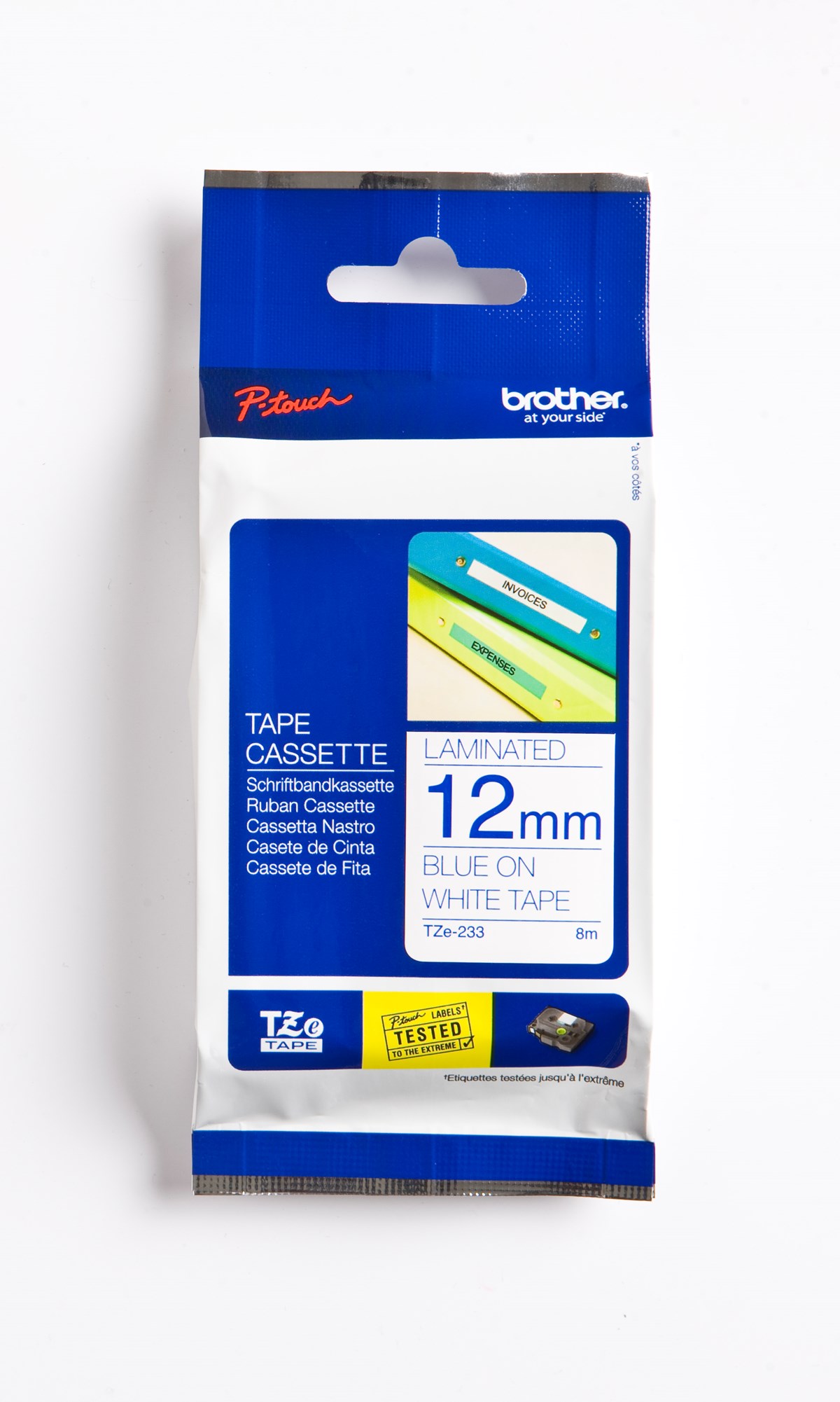 TZe tapekassetter är enkla att installera, finns i olika bredder, färger och material och säkerställer att din P-touch-märkmaskin uppfyller dina märkningsbehov. Mått: 12 mm x 8 m.