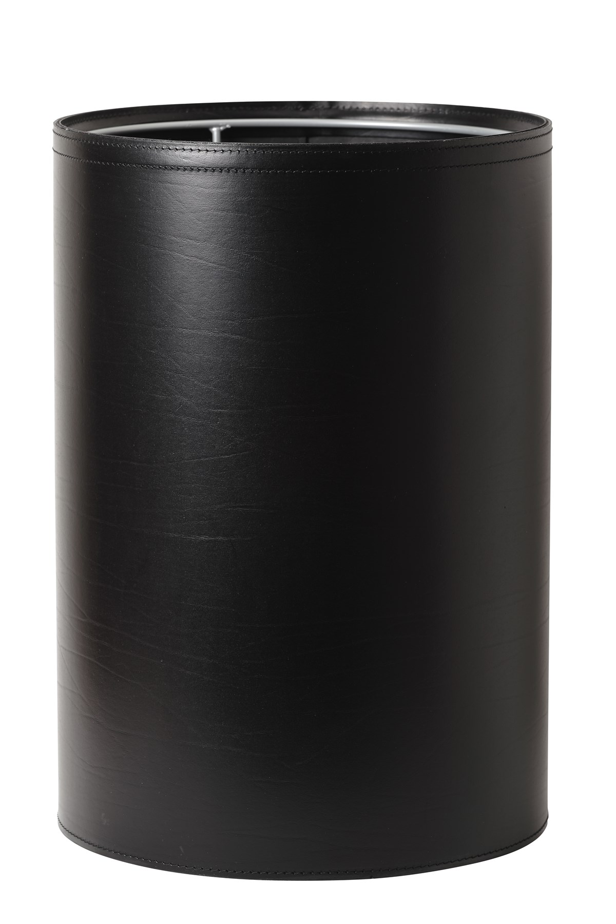 Stilren kollektion av skrivbordsprodukter i högklassigt svart läder med sydd kant. Hållbart och mycket snyggt för din personliga stil på kontoret eller hemma. Avvikande färg på tråd och andra storlekar kan erbjudas. Diameter 30 cm, höjd 42 cm. Som extra tillbehör finns en separat ställning för plastpåsen.