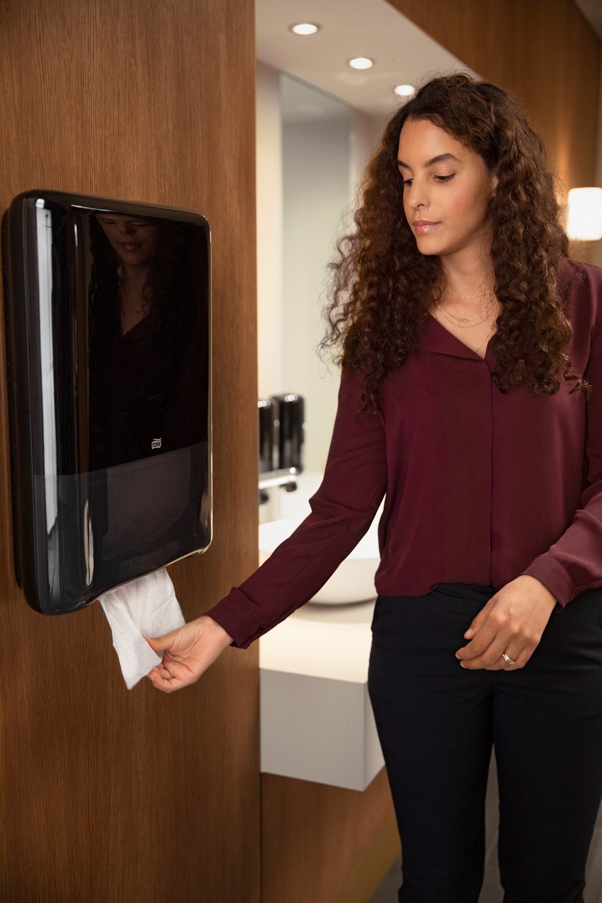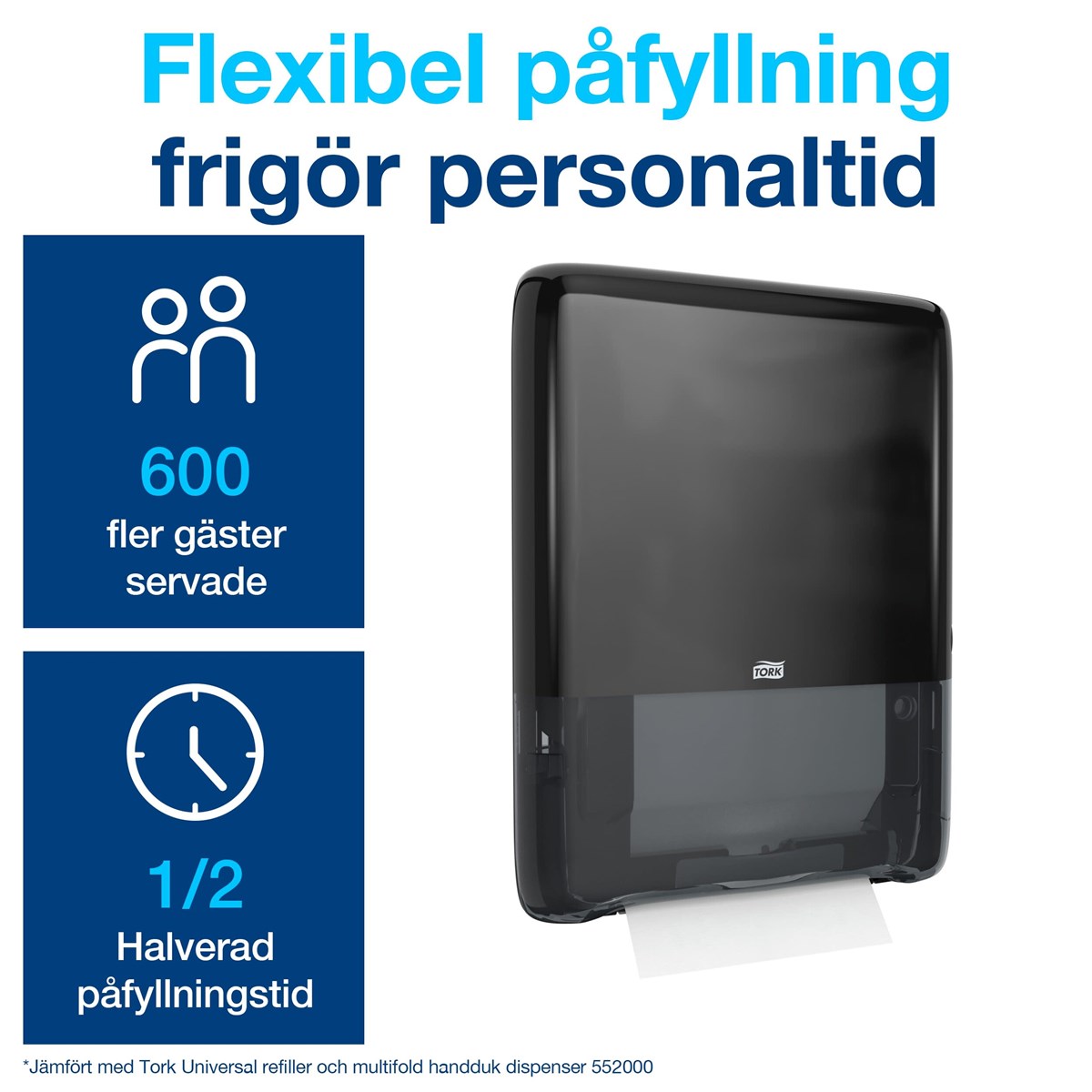 Utformad för välbesökta toalettutrymmen. Rymmer 1230 handdukar. Snabb utmatning och enkel att fylla på. Refillindikator visar när det finns en halv bunt kvar (ca 200 handdukar). Mått: (H x B x D) 49 x 37 x 10 cm.