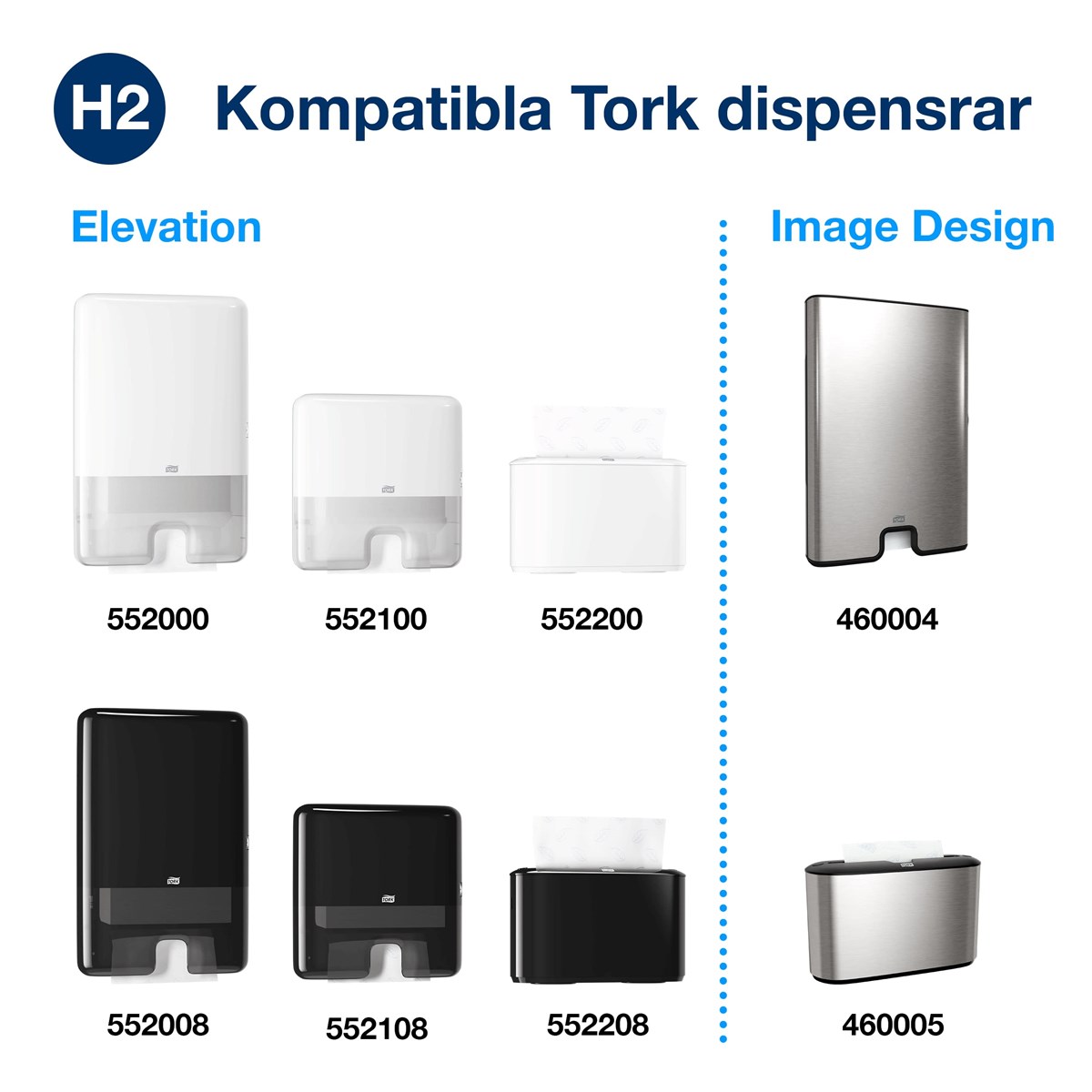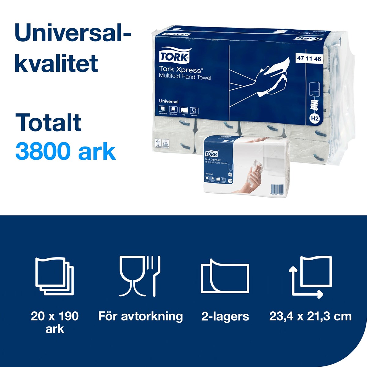 2-lags vitt papper i baskvalitet (Universal). Lövmönstrad dekor. Arken är vikta så att nästa ark automatiskt dras fram. Mått: 23,5 x 21 cm. 190 st/bunt, 3800 st/förp. Passar till Tork hållare H2.