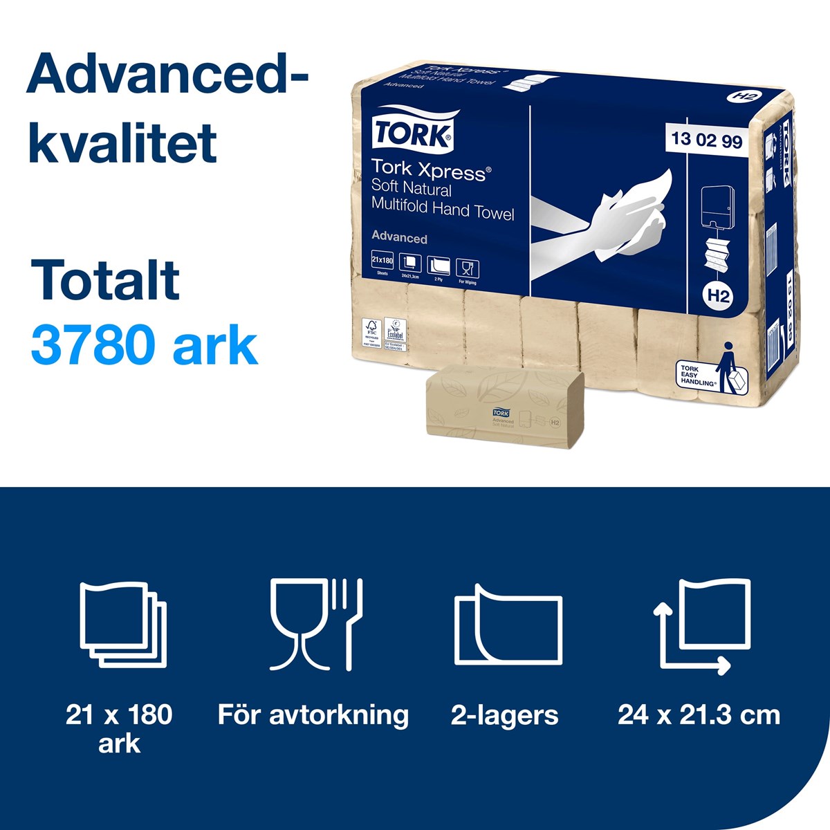 Handdukarna är skonsamma mot huden och förmedlar en känsla av hög kvalitet. Den ljusbruna färgen kommer från fibrer av återvunna kartonger. Inga färgämnen tillsätts vid tillverkningen. Kompatibel med Tork H2-dispensrar. Lämpliga för toalettutrymmen med medelhög besöksfrekvens. Dispensern får plats i små utrymmen och erbjuder dina gäster både komfort och hygien. Pappret tillverkas av 100 % återvunna fibrer. Mått: 24x21,3 cm. 180 st/bunt, 3780 st/förp.