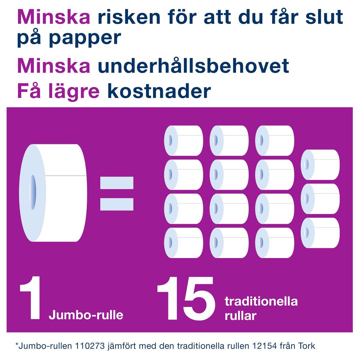 För välbesökta toalettutrymmen Sluten dispenser som skyddar rullarna och förbättrar hygienen Hög kapacitet för färre påfyllningar Optimal rullbroms minskar förbrukningen Smart rullhållare för restpapper som ger mindre avfall