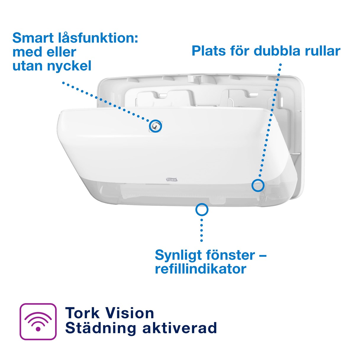 Modern hållare med hög kapacitet. För två Mini Jumbo T2-rullar. En rulle i taget används. Tillverkad i kraftig plast, låsbar. Mått: (H x B x D) 25,6 x 43,2 x 14,6 cm.