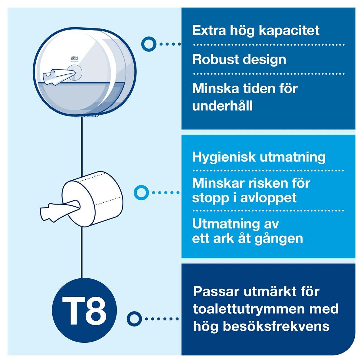 Hög kapacitet och mindre avfall för minskat underhåll Utmatning av ett ark i taget minskar förbrukningen Bidrar till förbättrad hygien då gästerna endast vidrör vad de tar för sig Låsfunktion som skyddar rullarna Perfekt för välbesökta toalettutrymmen