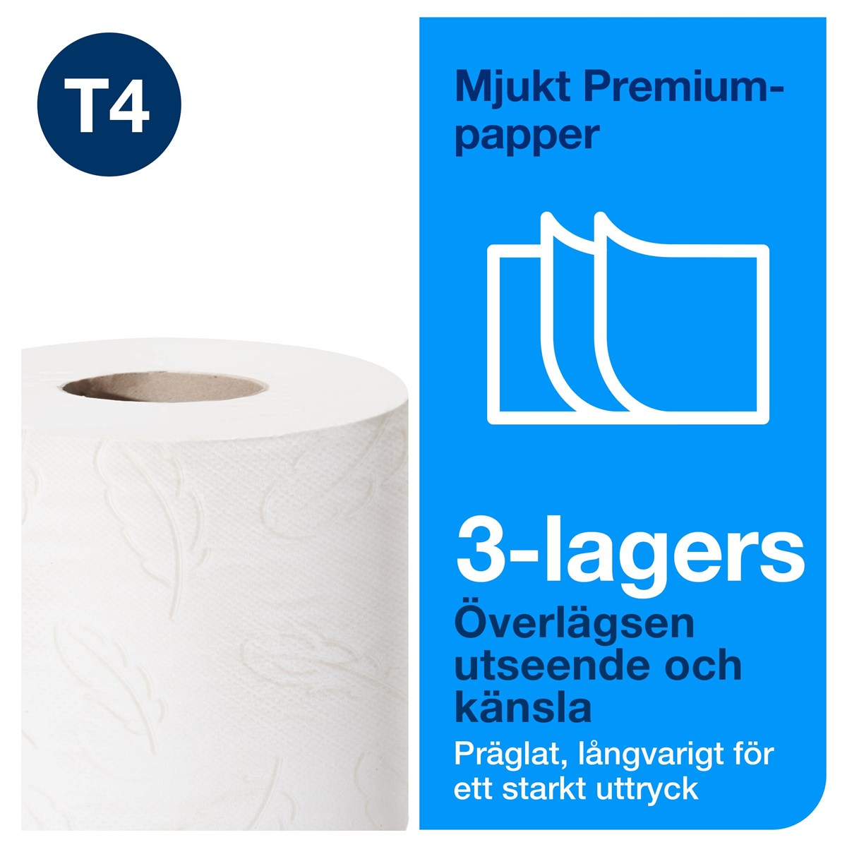 Se till att gäster i toalettutrymmen med låg besöksfrekvens känner sig lika bekväma som hemma med detta toalettpapper i premiumkvalitet. Dess mjukhet och ljusa utseende kombineras med en tilltalande mönsterprägling och hög prestanda, som skapar ett bestående, positivt intryck. Toalettpappret i storpack är dessutom lyxigt tjockt med sina tre lager. Använd med Tork T4-dispensrar för toalettpapper för en bekväm upplevelse. Den unika avrivningsfunktionen gör det enkelt att komma åt papper. 35 meter/rulle.. 42 rullar/förp.