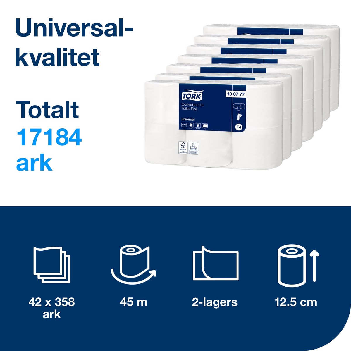 Tork Toalettpapper Universal passar perfekt för toalettutrymmen med låg besöksfrekvens. Basbehoven uppfylls och valuta fås för pengarna.