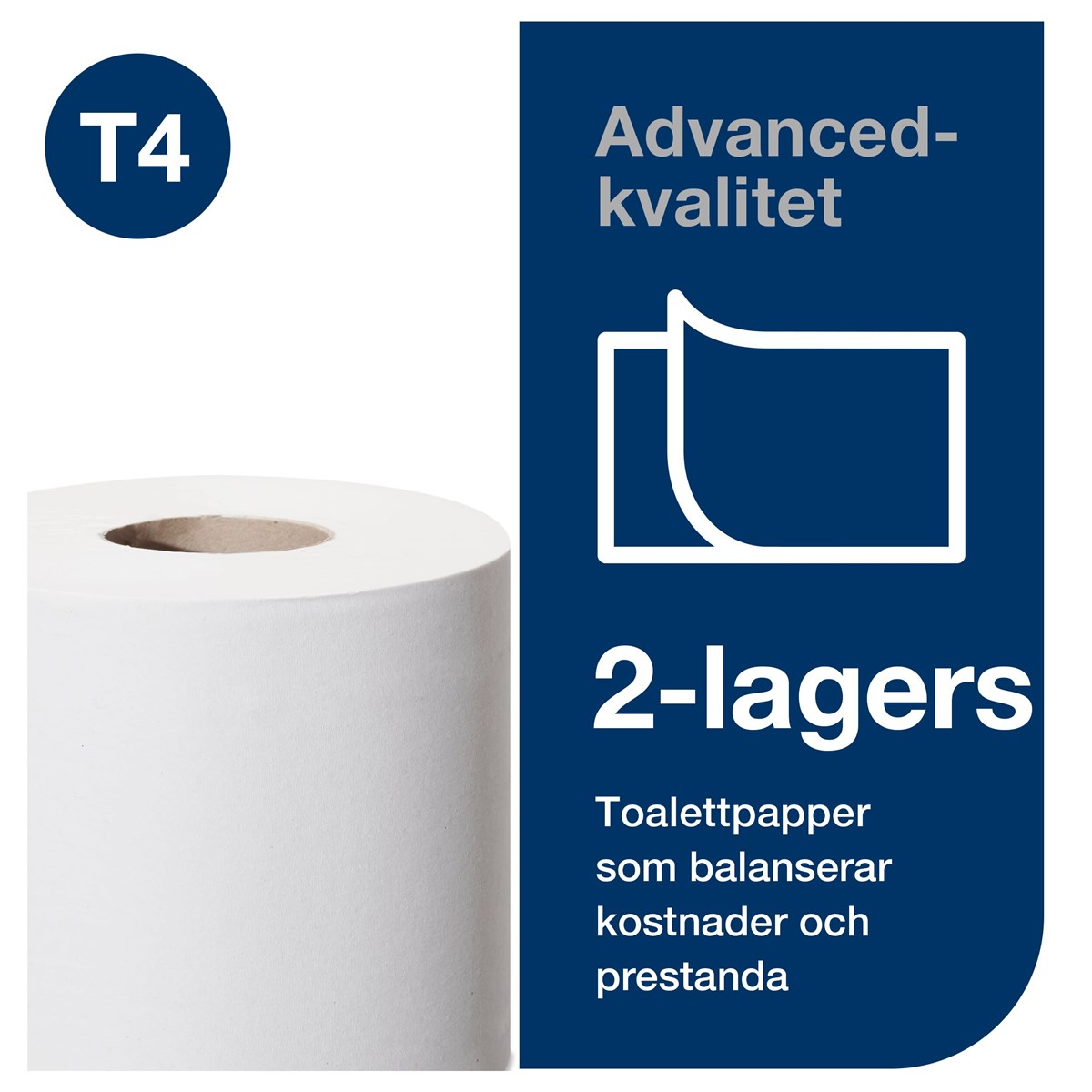 Vitt, 2-lags toalettpapper av hög kvalitet (Advanced). Mönsterprägling. Smidig förpackning med handtag – enkelt att bära med sig. 31,4 m/rulle. 24 rullar/förp.