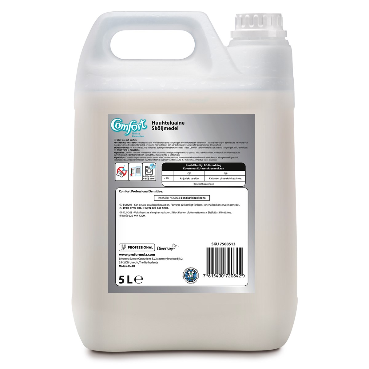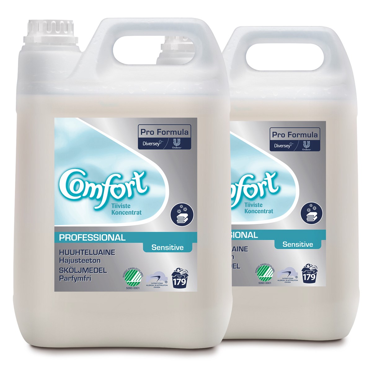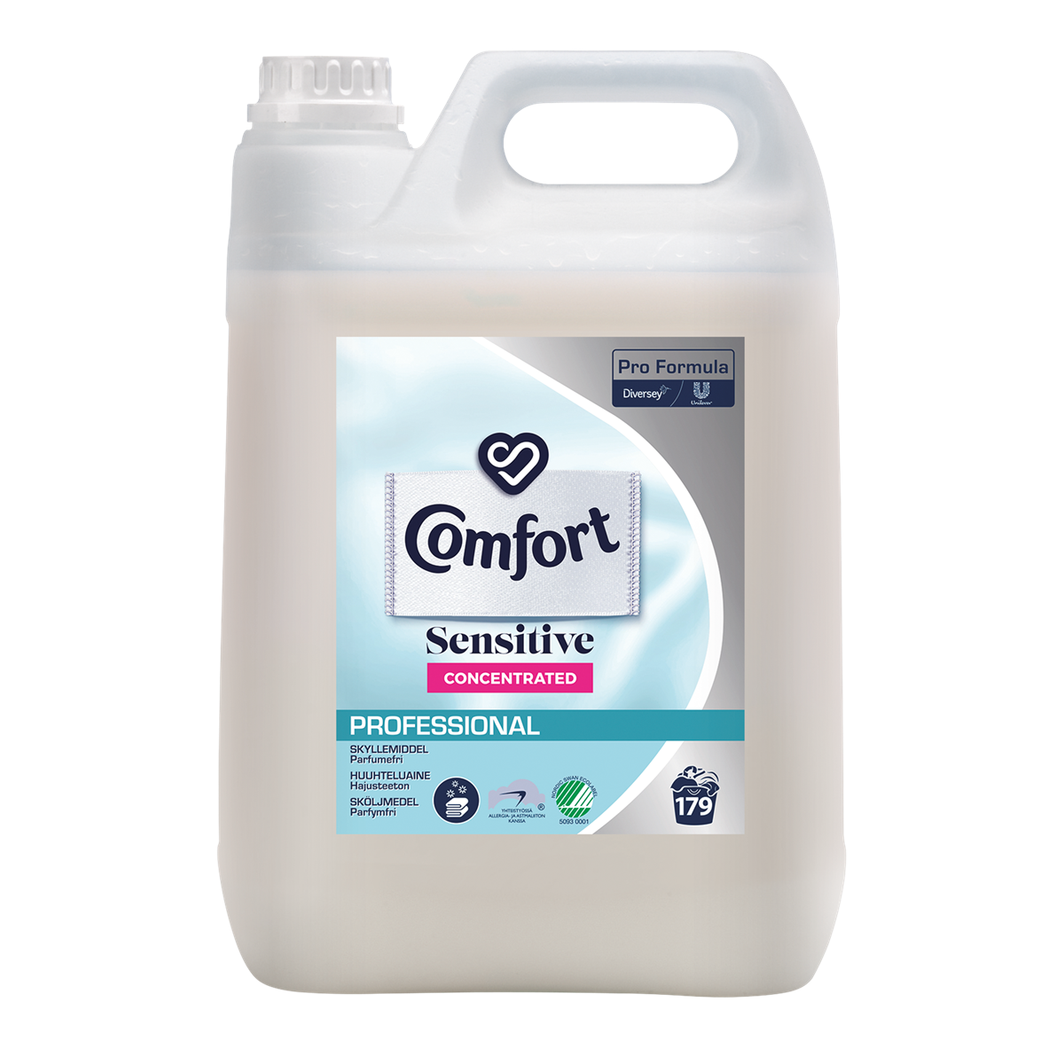 Comfort Sensitive Professional är ett skölj- och antistatmedel för alla slags textilier. Det innehåller inte parfym eller färg. Det är främst avsedd för manuell dosering, men kan även användas för automatisk dosering.